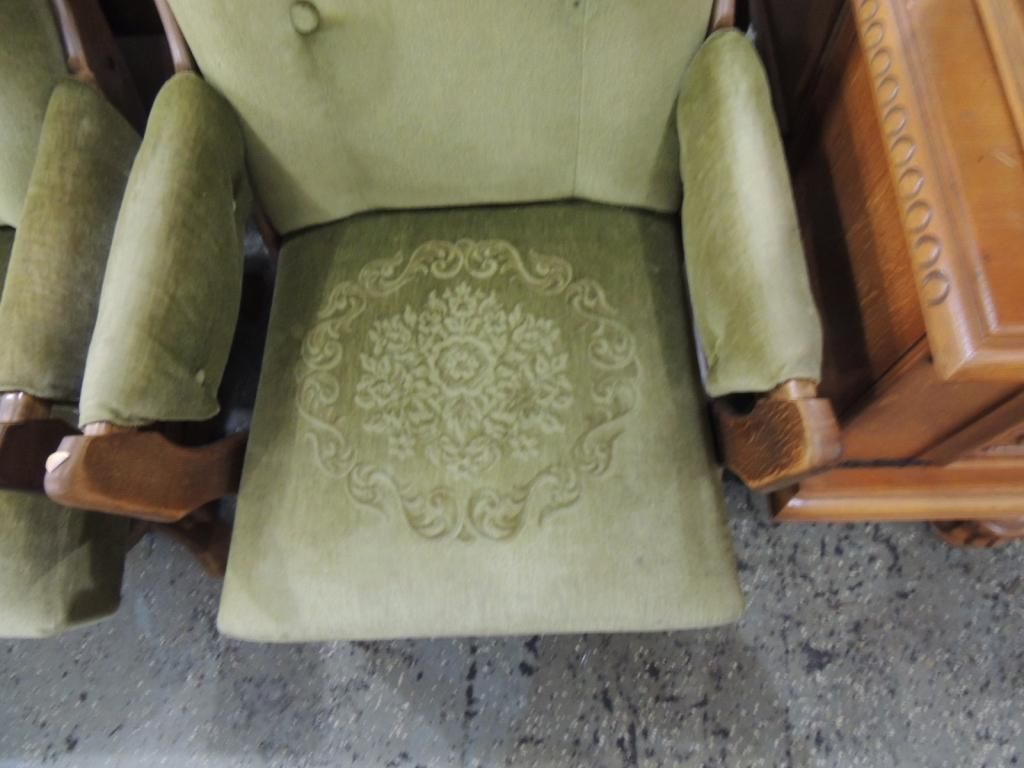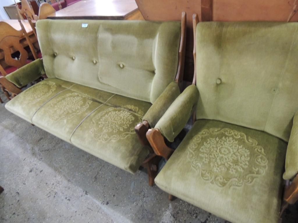VINTGAE VELVET GREEN SOFA & CHAIR. WOODEN DETAILS OLIVE GREEN VELVET WITH DESIGN ON SEAT. ELEGANT AS SHOWN SEE PHOTO FOR MORE DETIALS.