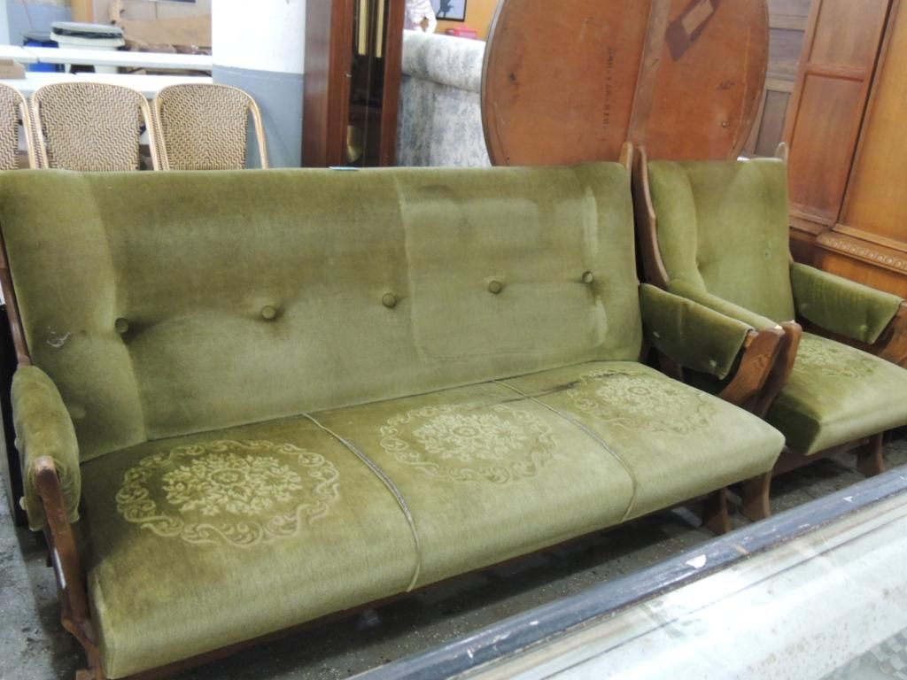 VINTGAE VELVET GREEN SOFA & CHAIR. WOODEN DETAILS OLIVE GREEN VELVET WITH DESIGN ON SEAT. ELEGANT AS SHOWN SEE PHOTO FOR MORE DETIALS.