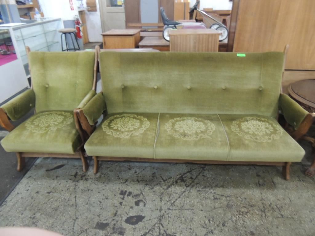 VINTGAE VELVET GREEN SOFA & CHAIR. WOODEN DETAILS OLIVE GREEN VELVET WITH DESIGN ON SEAT. ELEGANT AS SHOWN SEE PHOTO FOR MORE DETIALS.