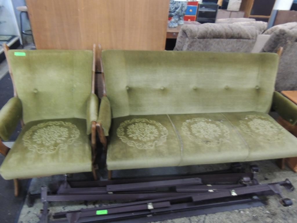 VINTGAE VELVET GREEN SOFA & CHAIR. WOODEN DETAILS OLIVE GREEN VELVET WITH DESIGN ON SEAT. ELEGANT AS SHOWN SEE PHOTO FOR MORE DETIALS.