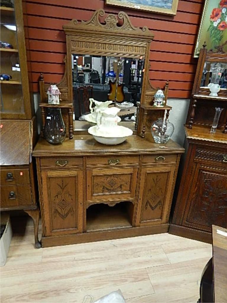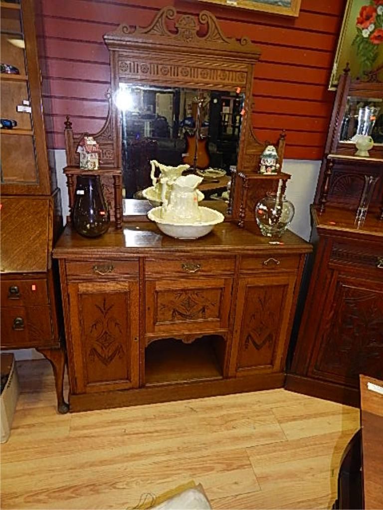 VINTAGE VICTORIAN CARVED OAK SIDEBOARD WITH MIRRORED BACK GALLERY