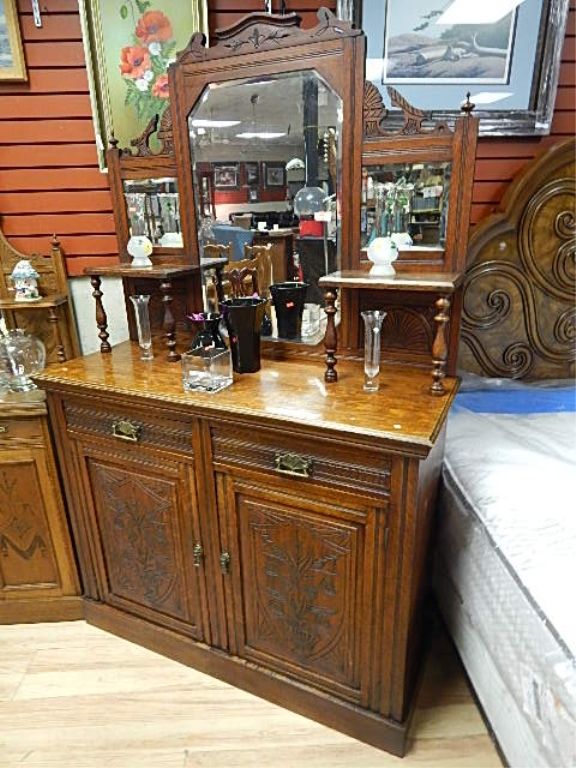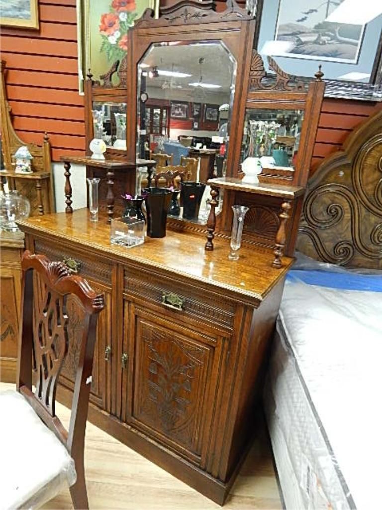VINTAGE VICTORIAN OAK SIDEBOARD WITH MIRRORED BACK GALLERY