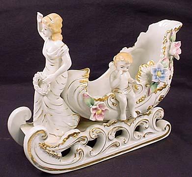 VINTAGE VICTORIAN STYLE FIGURINE OF LADY W/ SLEIGH AND CHERUB