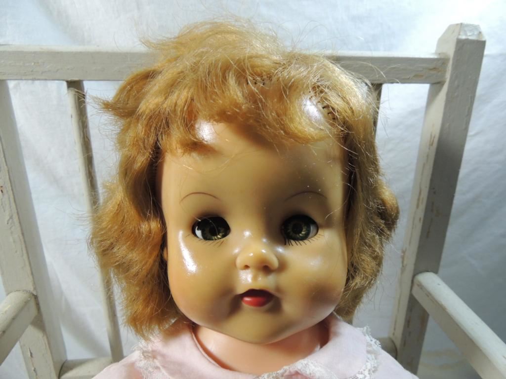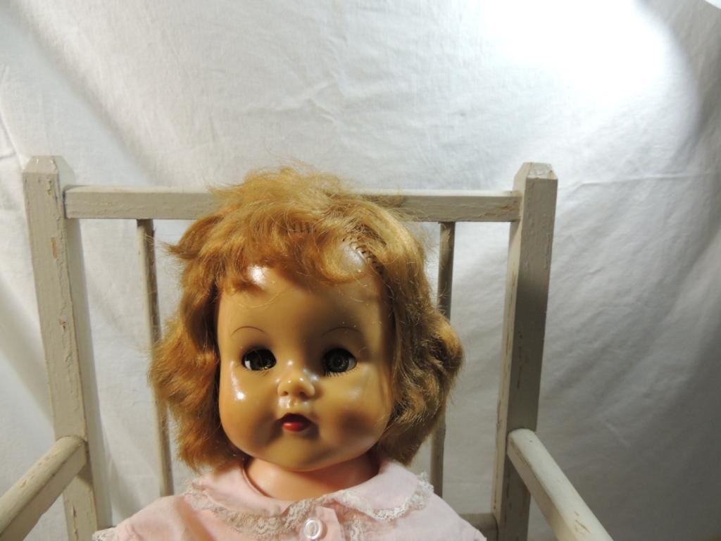 GREAT CONDITION. BELIEVED TO BE AN UNMARKED MADAME ALEXANDER 1950s DOLL. COLLECTIBLE RED HAIR SLEEP EYES. PINK DRESS AS SHOWN SEE PHOTO FOR MORE DETAILS.