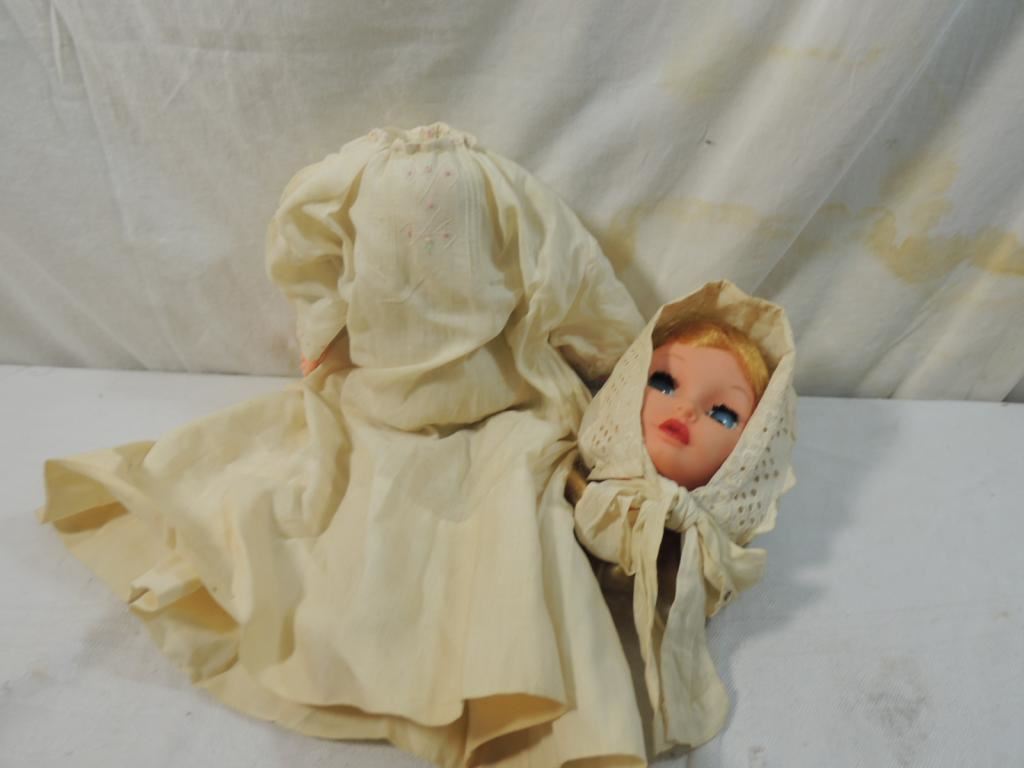 NEEDS SOME REPAIR, VINTAGE VINYL DOLL, BEAN FILLED BODY, COLLECTIBLE DOLL AS SHOWN SEE PHOTO FOR MORE DETAILS.