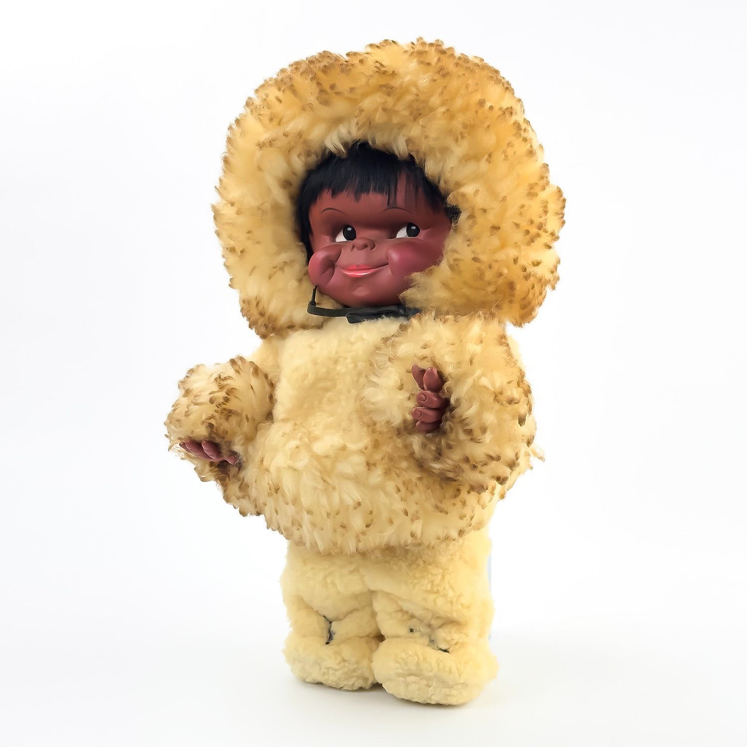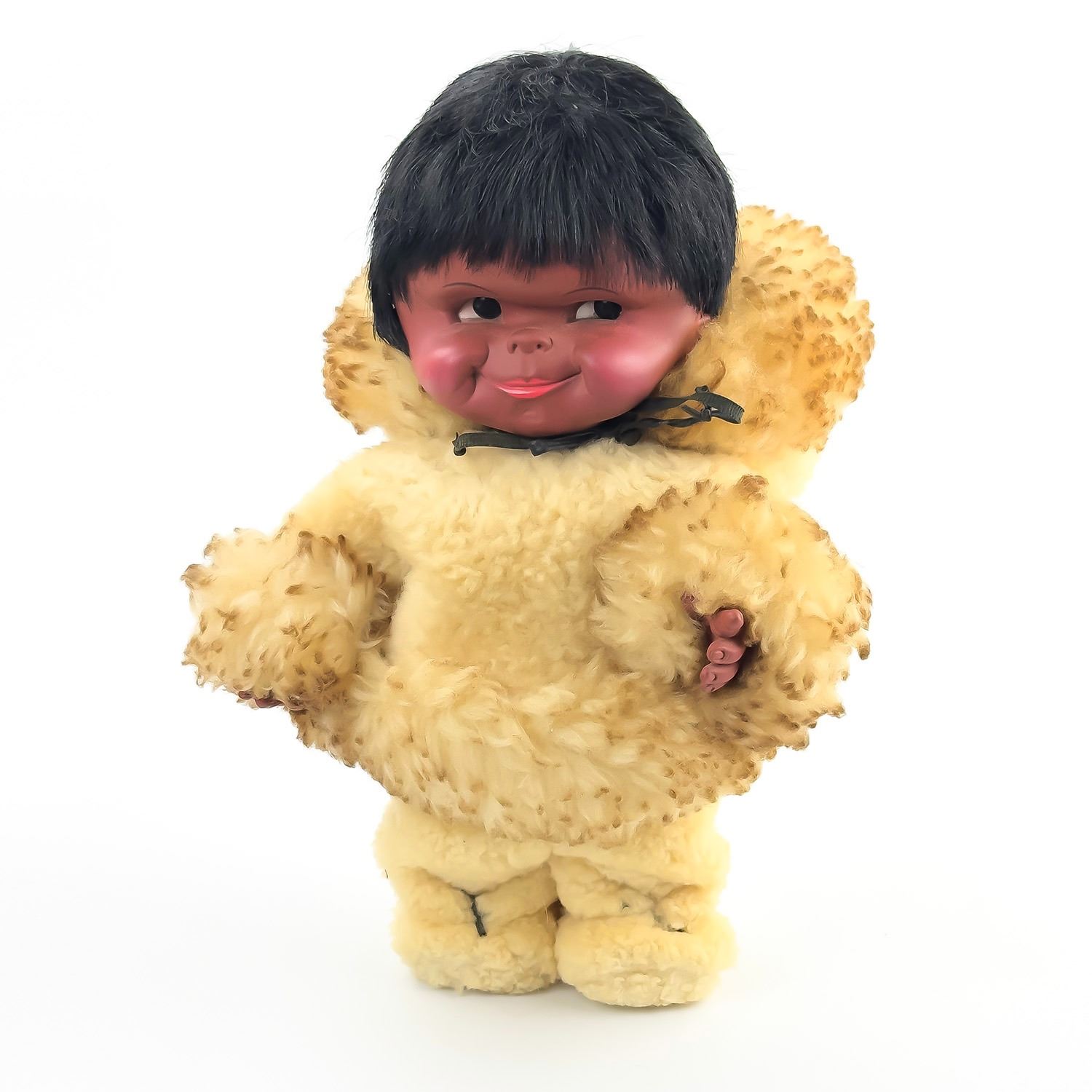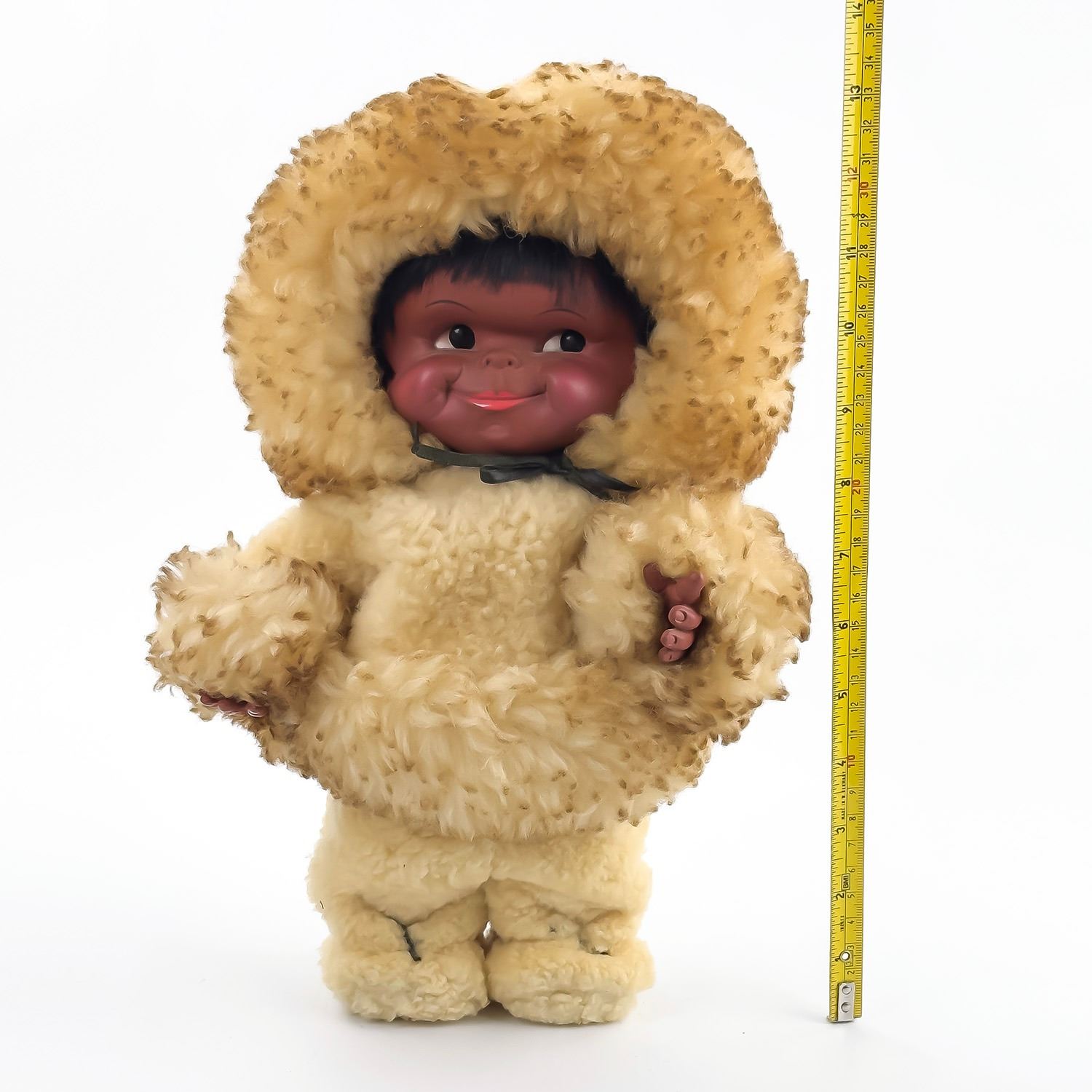 #8027 - VINTAGE 1960’S ESKIMO KIMMIE DOLL - NO MARKINGS, BUT I BELIEVE DOLL WAS MADE BY CANADIAN REGAL TOY CO. DOLL IS MADE OF VINYL AND CLOTHING IS LEATHER AND FUR. DOLL IS JOINTED - ARMS, LEGS AND HEAD MOVE. COLLECTIBLE TOY DOLL HOME DECOR. MEASURES: 13” (33 CM) TALL BY 9” (23 CM) WIDE AND 7.5” (19 CM) DEEP WITH HOOD DOWN