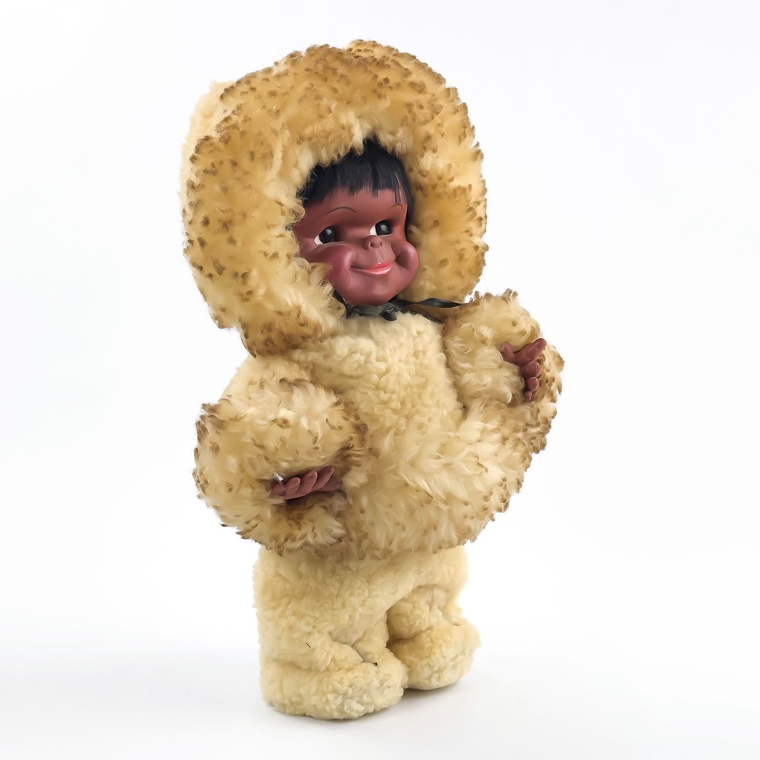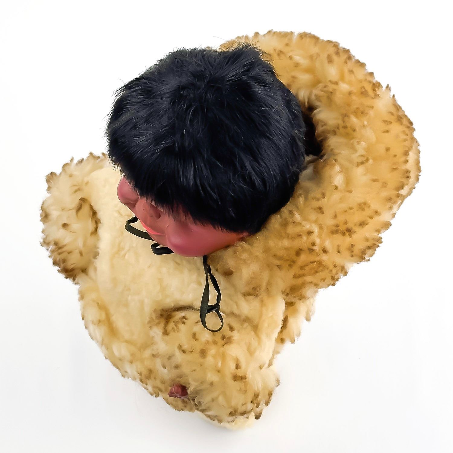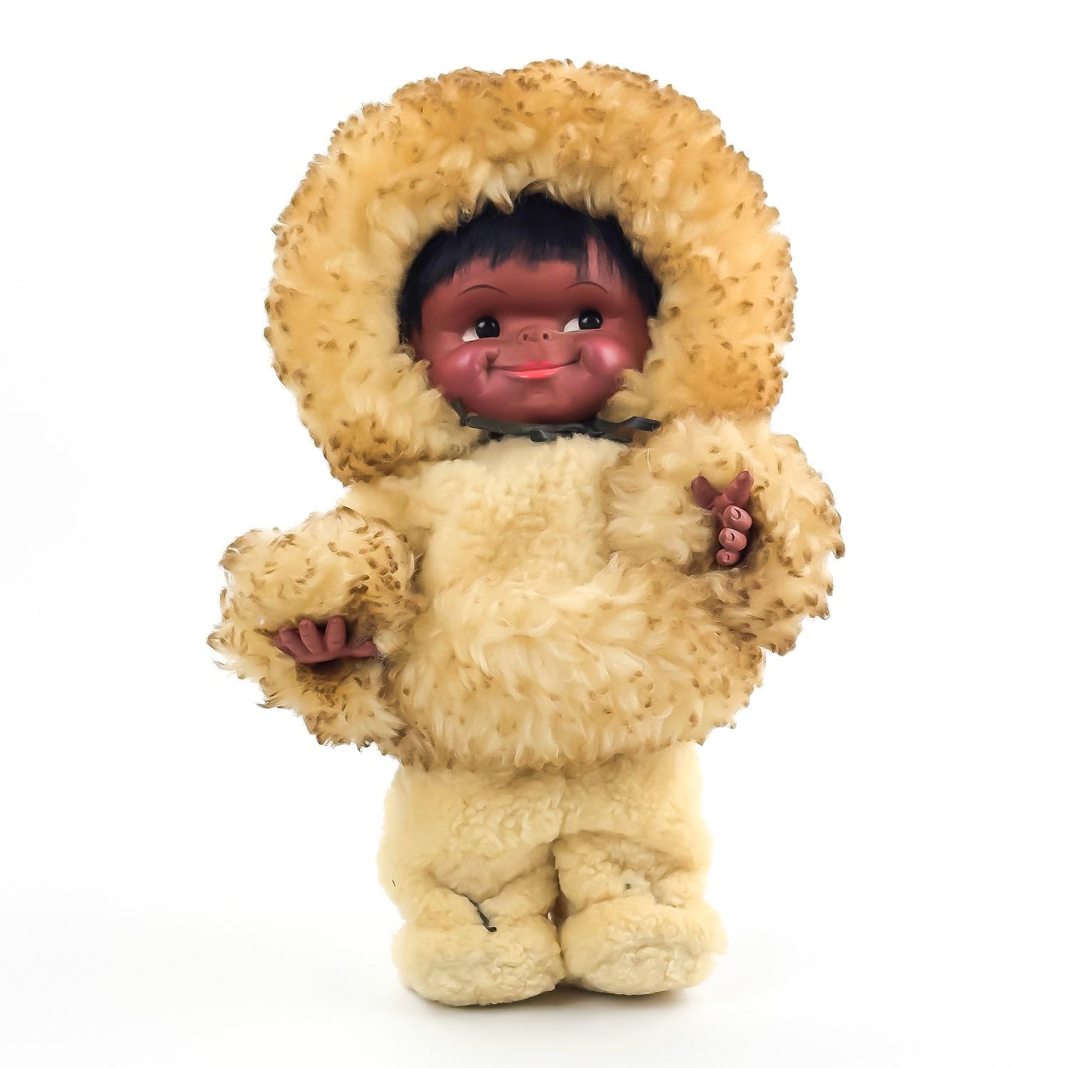 #8027 - VINTAGE 1960’S ESKIMO KIMMIE DOLL - NO MARKINGS, BUT I BELIEVE DOLL WAS MADE BY CANADIAN REGAL TOY CO. DOLL IS MADE OF VINYL AND CLOTHING IS LEATHER AND FUR. DOLL IS JOINTED - ARMS, LEGS AND HEAD MOVE. COLLECTIBLE TOY DOLL HOME DECOR. MEASURES: 13” (33 CM) TALL BY 9” (23 CM) WIDE AND 7.5” (19 CM) DEEP WITH HOOD DOWN