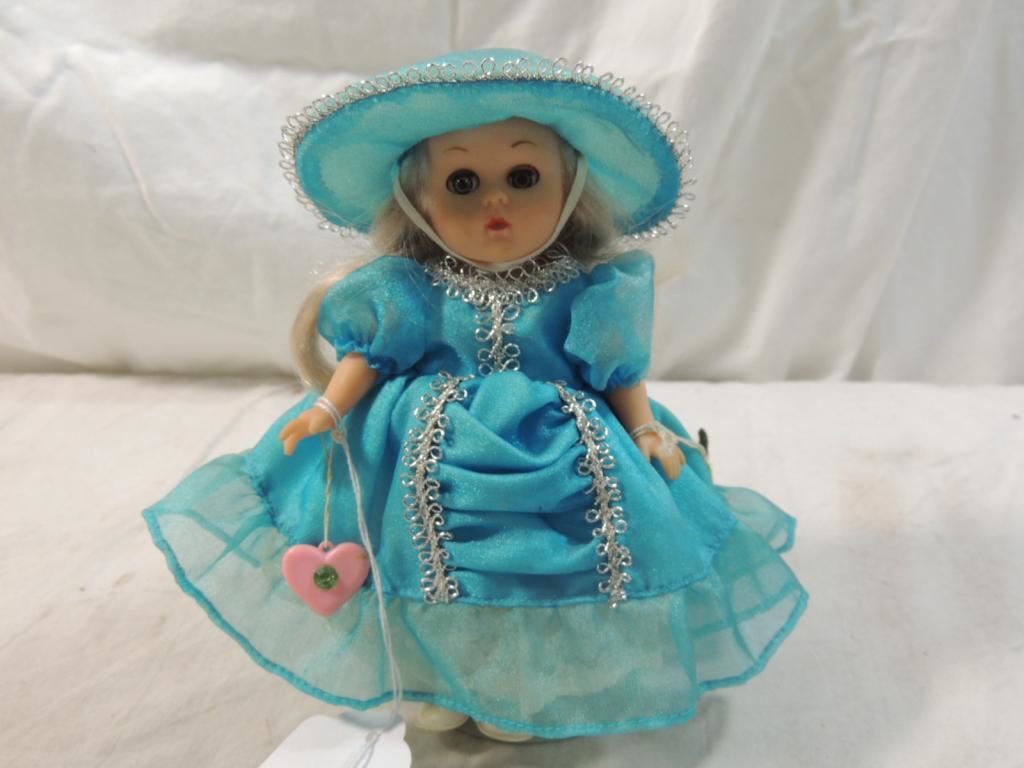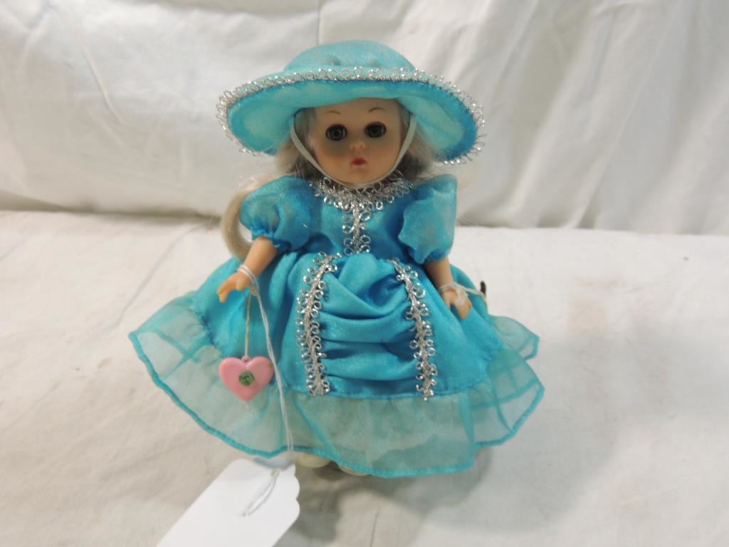 VINTAGE VOGUE GINNY DOLL, COLLECTIBLE DOLL, SMALL DOLL, BLUE DRESS DOLL, TEAL DOLL, ON STAND, COLLECTIBLE DOLL AS SHOWN SEE PHOTO FOR MORE DETAILS.