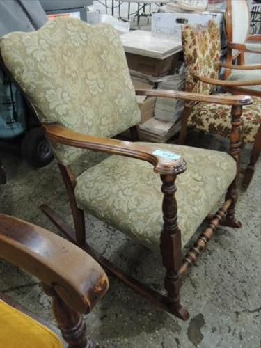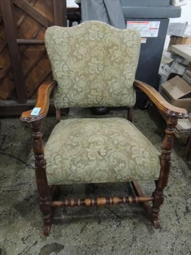 VINTAGE WALNUT SPINDLE CUSHIONED ROCKING CHAIR. RE-UHPOLSTERED. AS SHOWN. VIEW PICTURE FOR DETAIL.