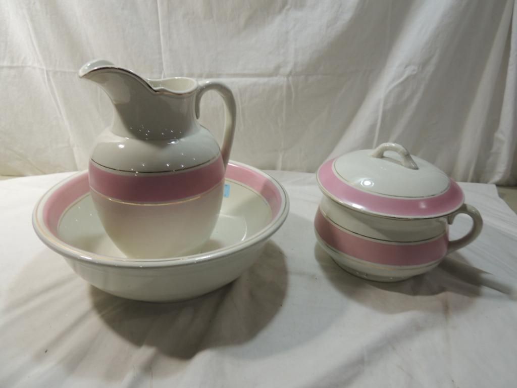 VINTAGE WASH SET BASIN AND WATER PITCHER WITH CHAMBER POT. BEAUTIFUL CREAM COLOR WITH PINK LINING AND GOLD TRIM AS SHOWN SEE PHOTO FOR MORE DETAILS.