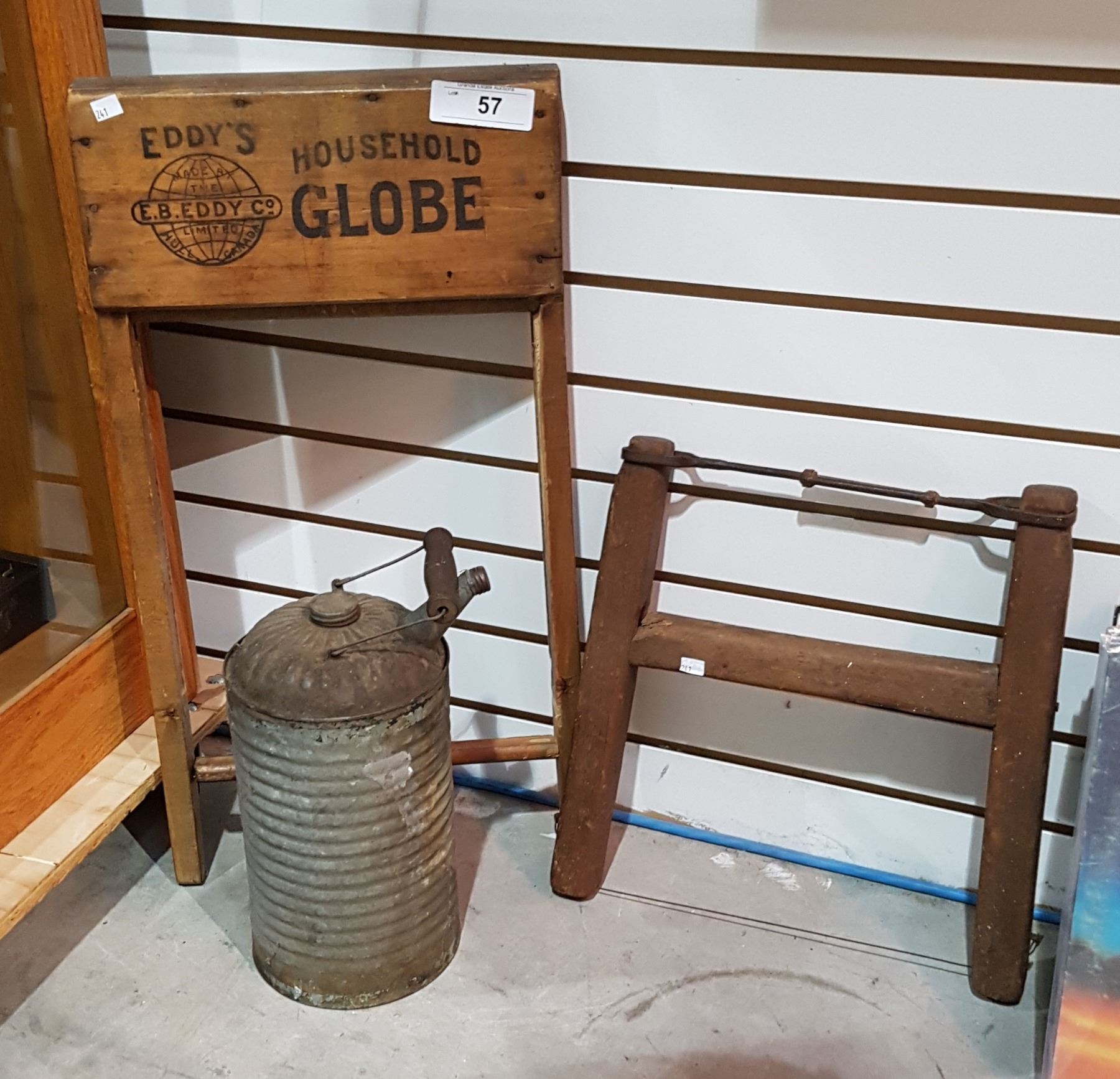 VINTAGE WASH BOARD FRAME, HANDSAW & GALVANIZED FUEL CAN