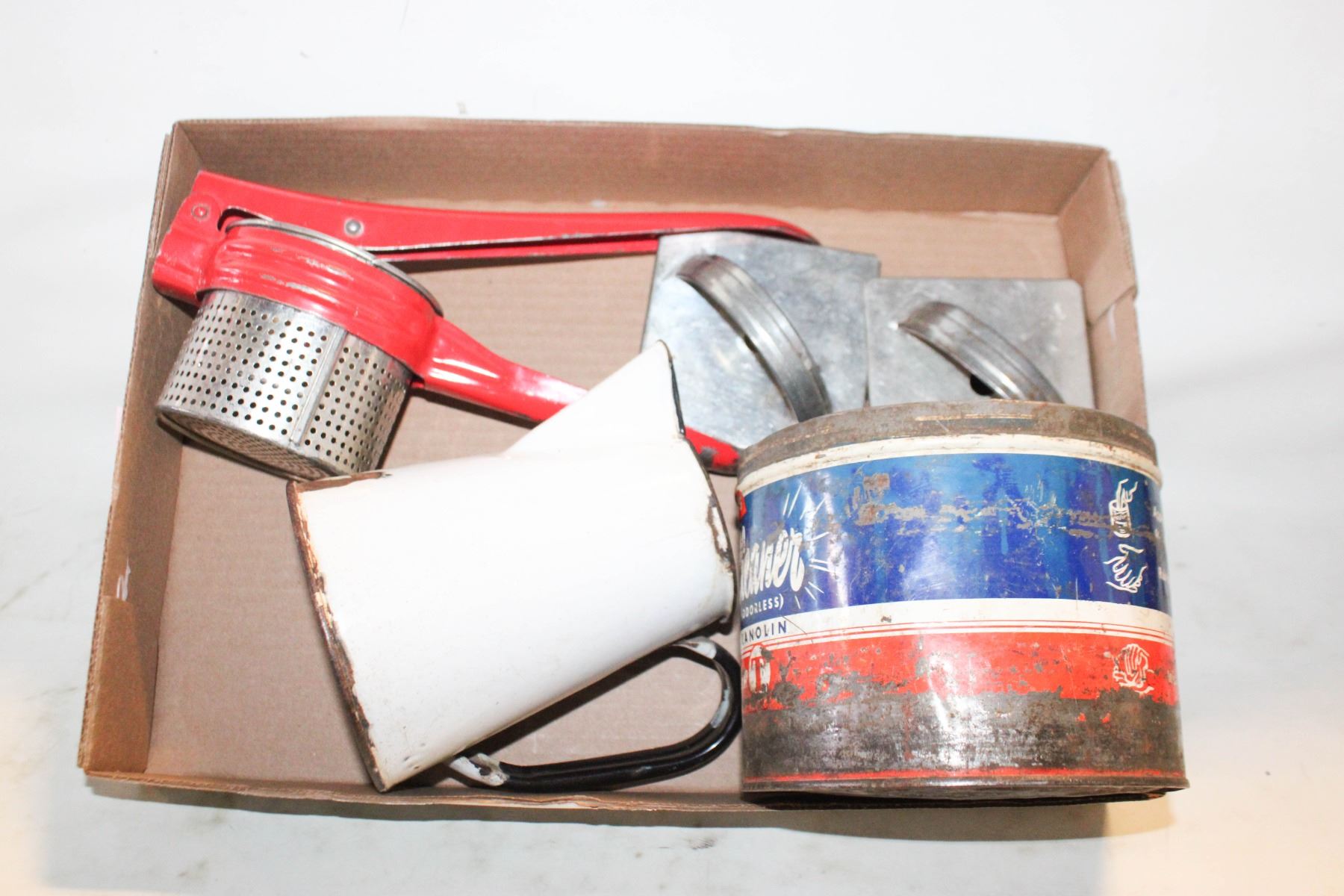 TIN, VINTAGE COOKIE CUTTERS, ENAMEL, MASHER LOT