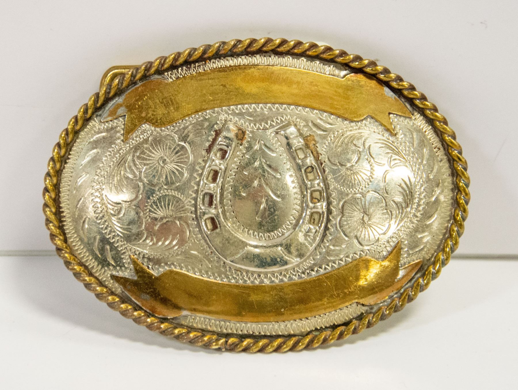 STAMPED ON BACK ALPACA MEXICO FEATURES ONE HORSE SHOE ON THE FRONT WITH HAND ENGRAVED FLOWERS AND DESIGNS MEASURES: 2 3/4" WIDE X 3 3/4" LONG. BELT 1 3/4" WIDTH
