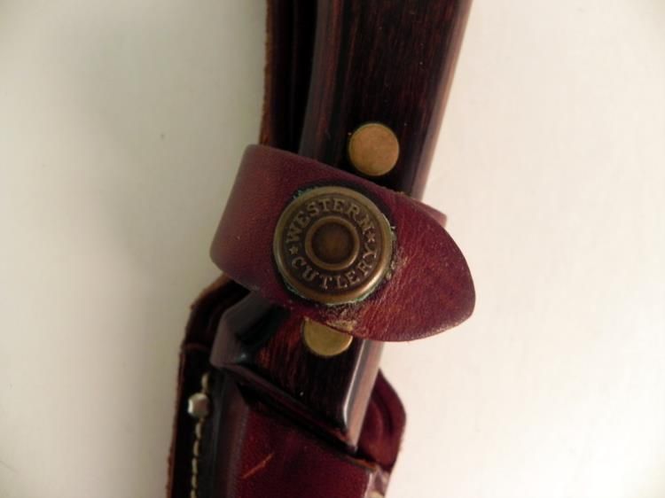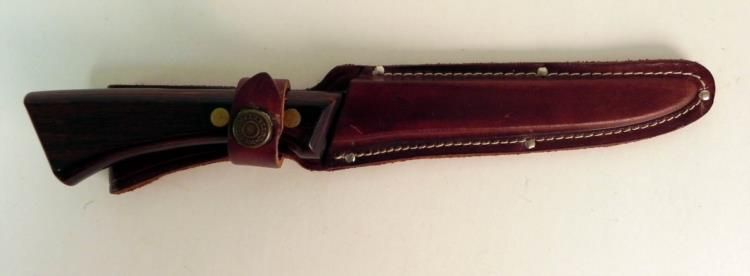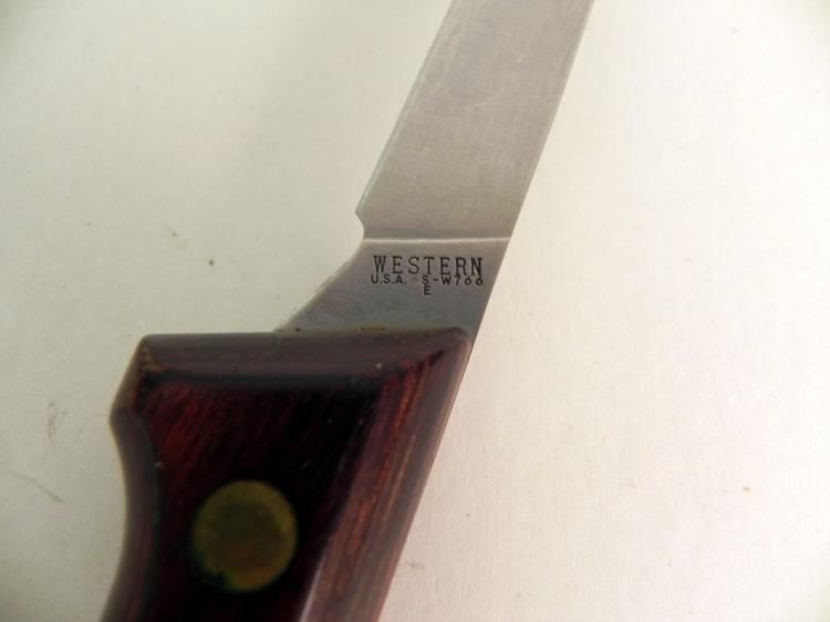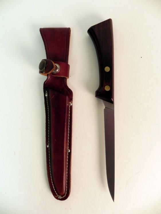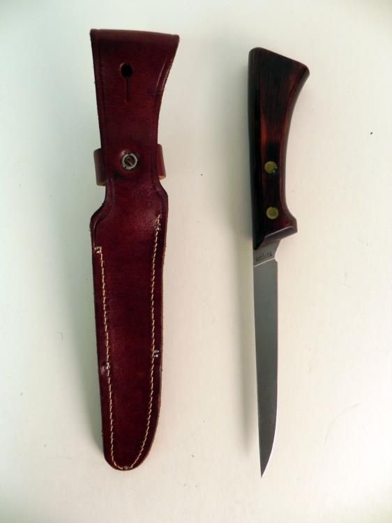 VINTAGE WESTERN FISH FILLET KNIFE WITH LEATHER SHEATH---WOOD HANDLE WITH DOUBLE RIVETS--6" BLADE--RICASSO MARKED "WESTERN SW766"--LEATHER SCABBARD IN GREAT CONDITION