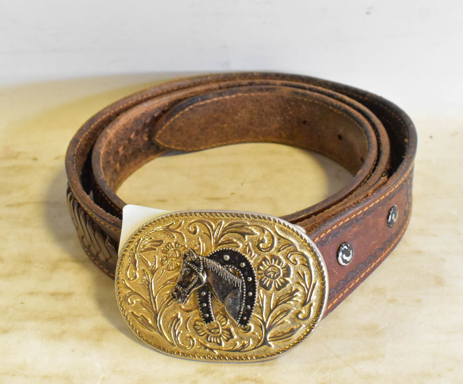 VINTAGE WESTERN THEMED LEATHER BELT AND BUCKLE