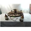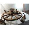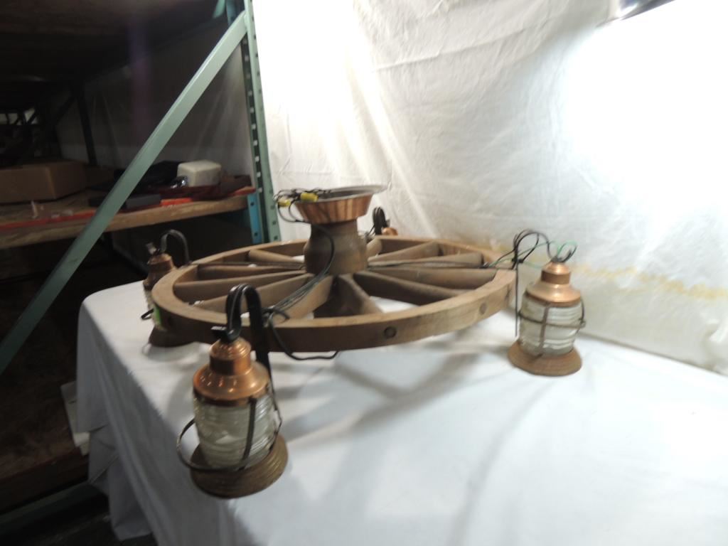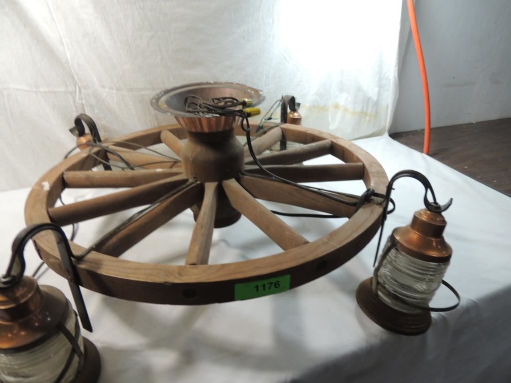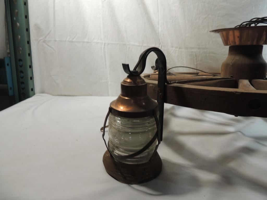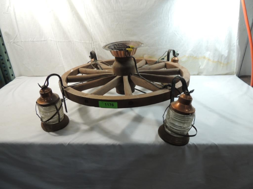 VINTAGE WESTERN WAGON WHEEL CHANDELIER WITH LANTERNS ONE LIGHT MISSING GLASS HANGING LIGHT FIXTURE AS SHOWN SEE PHOTO FOR MORE DETAILS