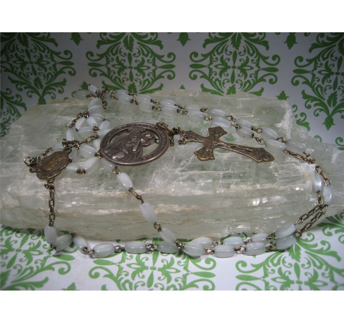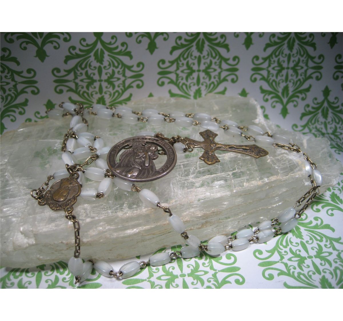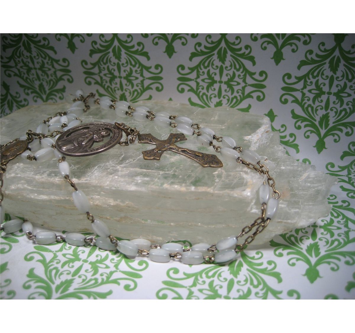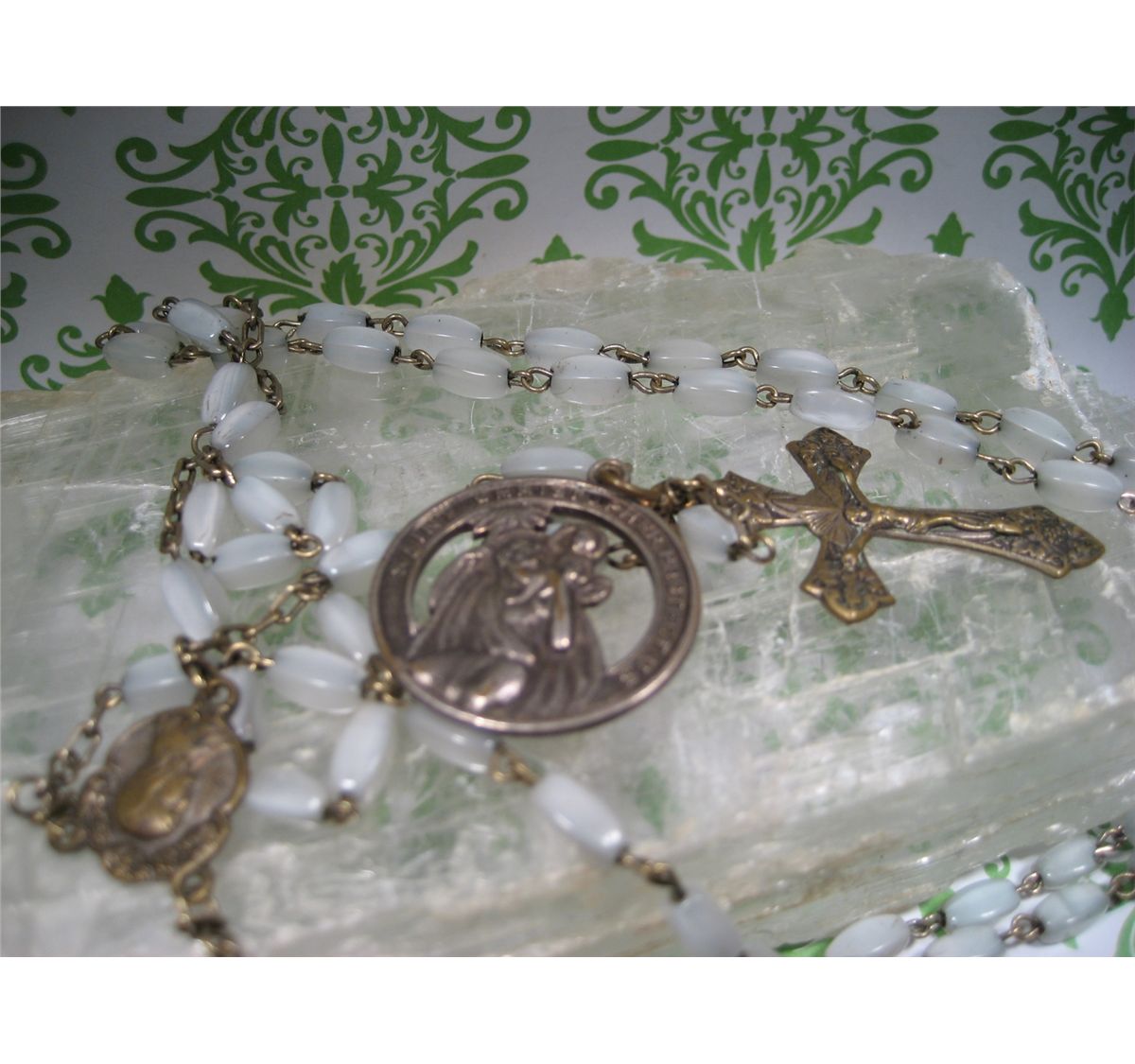 (1) VINTAGE WHITE BEADED MOTHER OF PEARL CATHOLIC ROSARY RELIGIOUS MEDAL AND CRUCIFIX