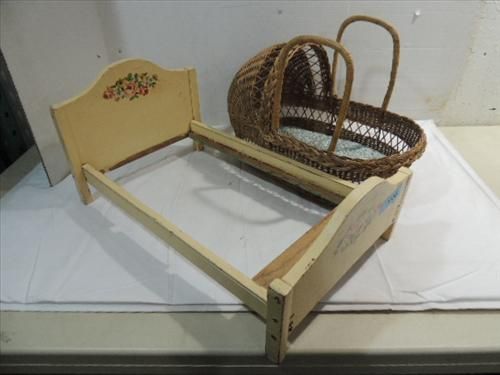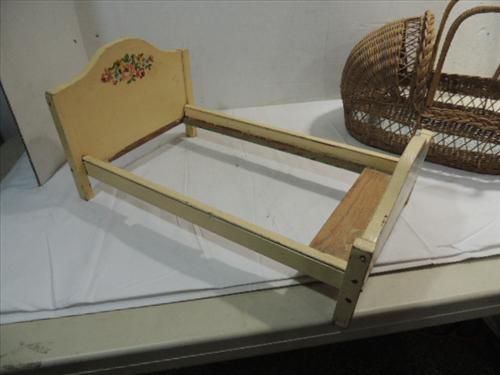VINTAGE WICKER 17X11 BABY DOLL BASINETT WITH HANDLES & 22X13 ALL WOOD HAND PAINTED BABY DOLL BED. AS SHOWN. VIEW PICTURE FOR DETAIL.