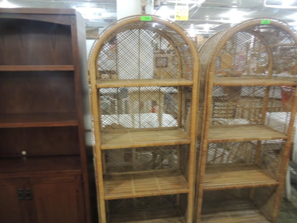 VINTAGE WICKER BOOKCASE, DECORATIVE, CURVE TOP, WICKER BOOKCASE, UNIQUE DECORATIVE CASE AS SHWON SEE PHOTO FOR MORE DETAILS.