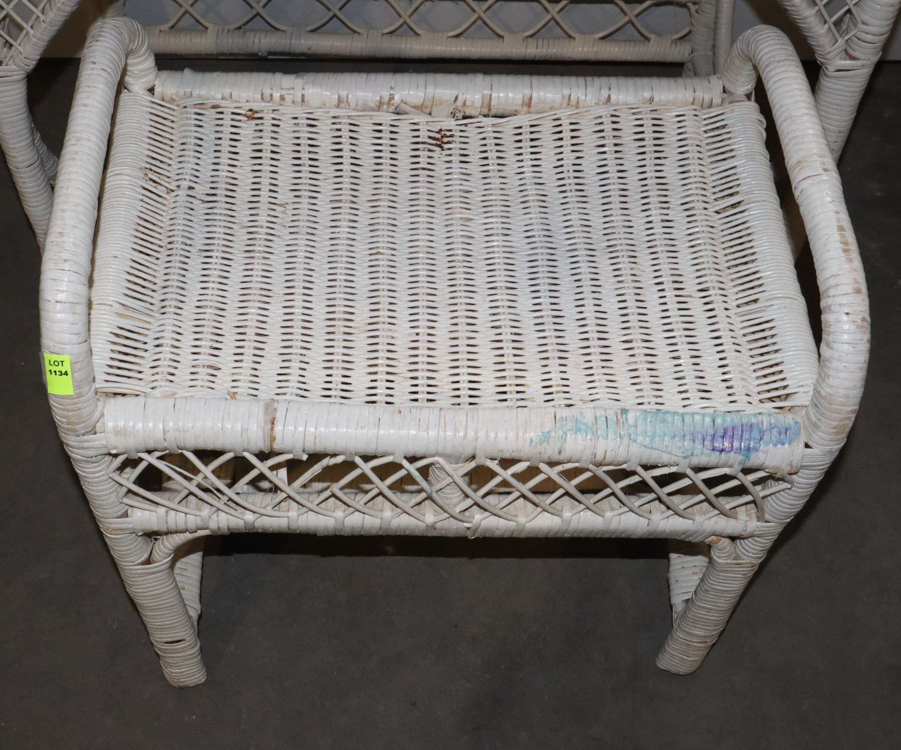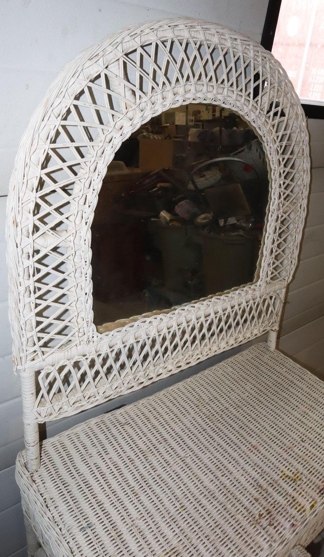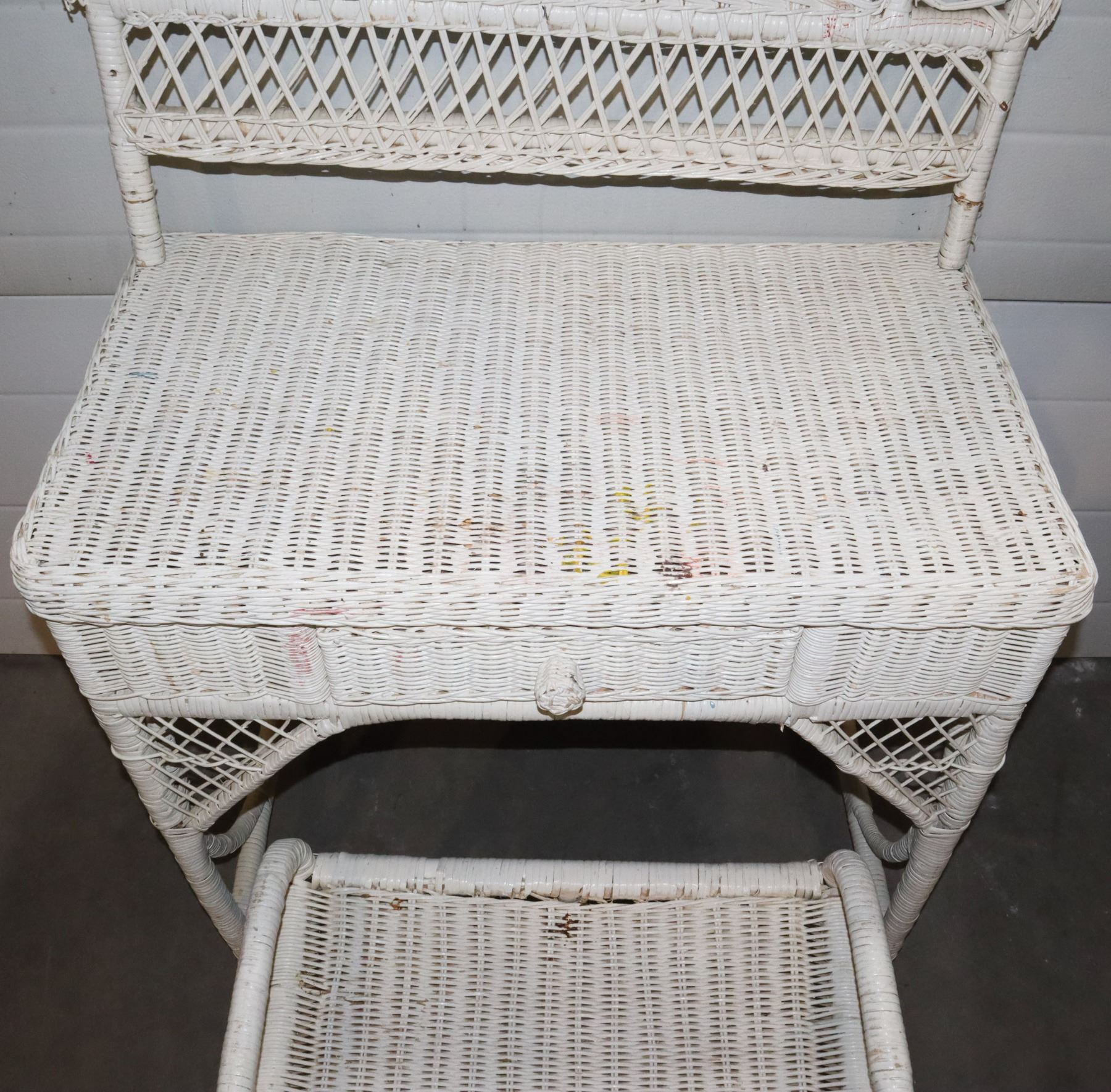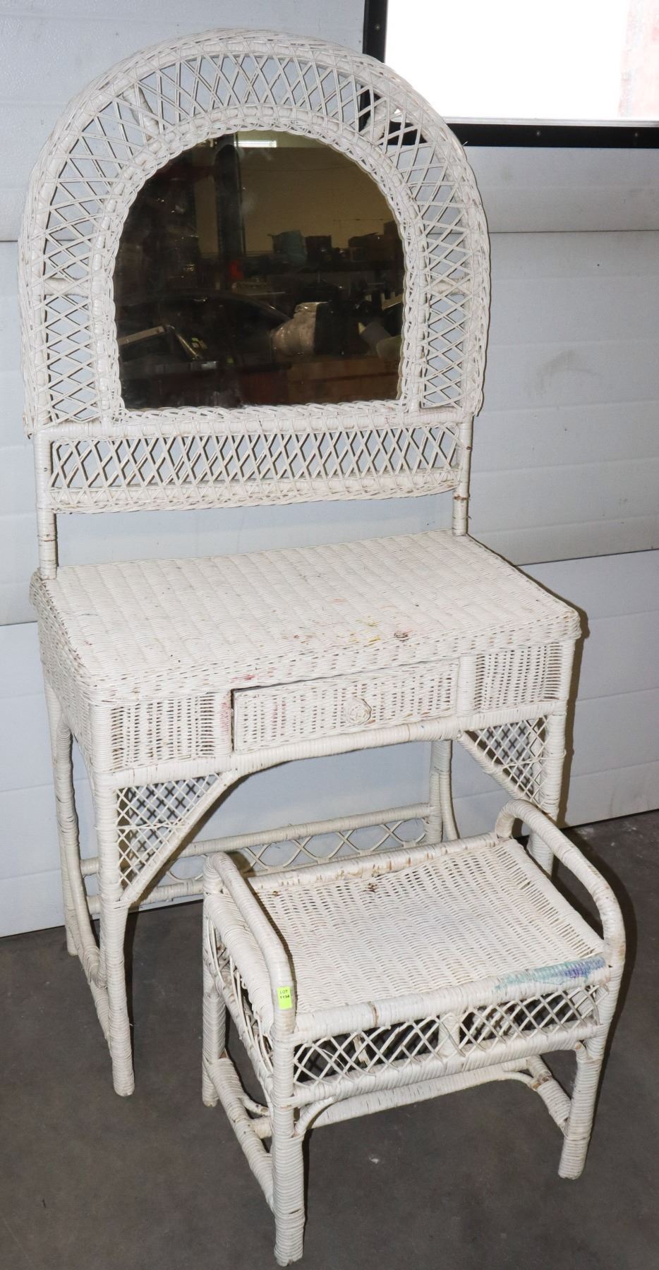VINTAGE WICKER VANITY SET. DESK, STOOL, MIRROR