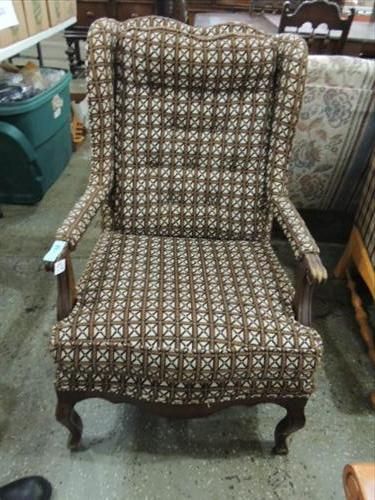 VINTAGE WING-BACK CUSHIONED READING CHAIR. RE-UHPOLSTERED. AS SHOWN. VIEW PICTURE FOR DETAIL.