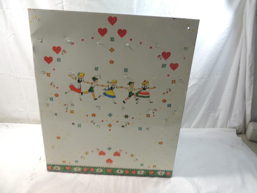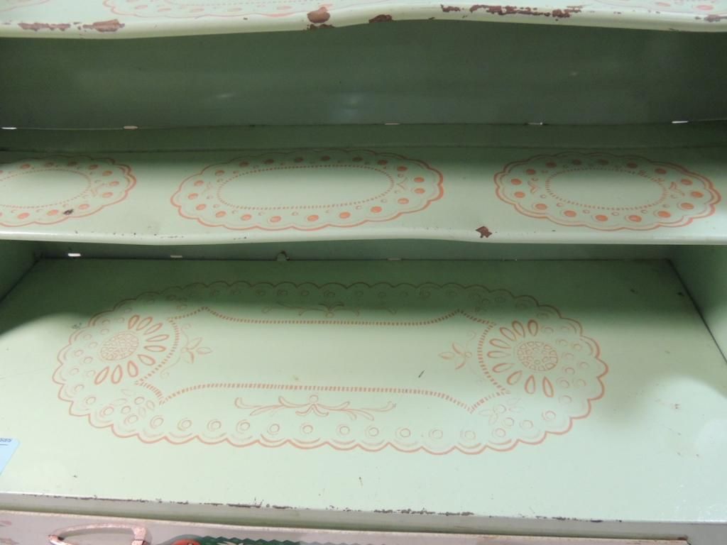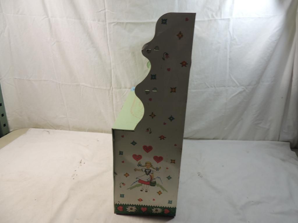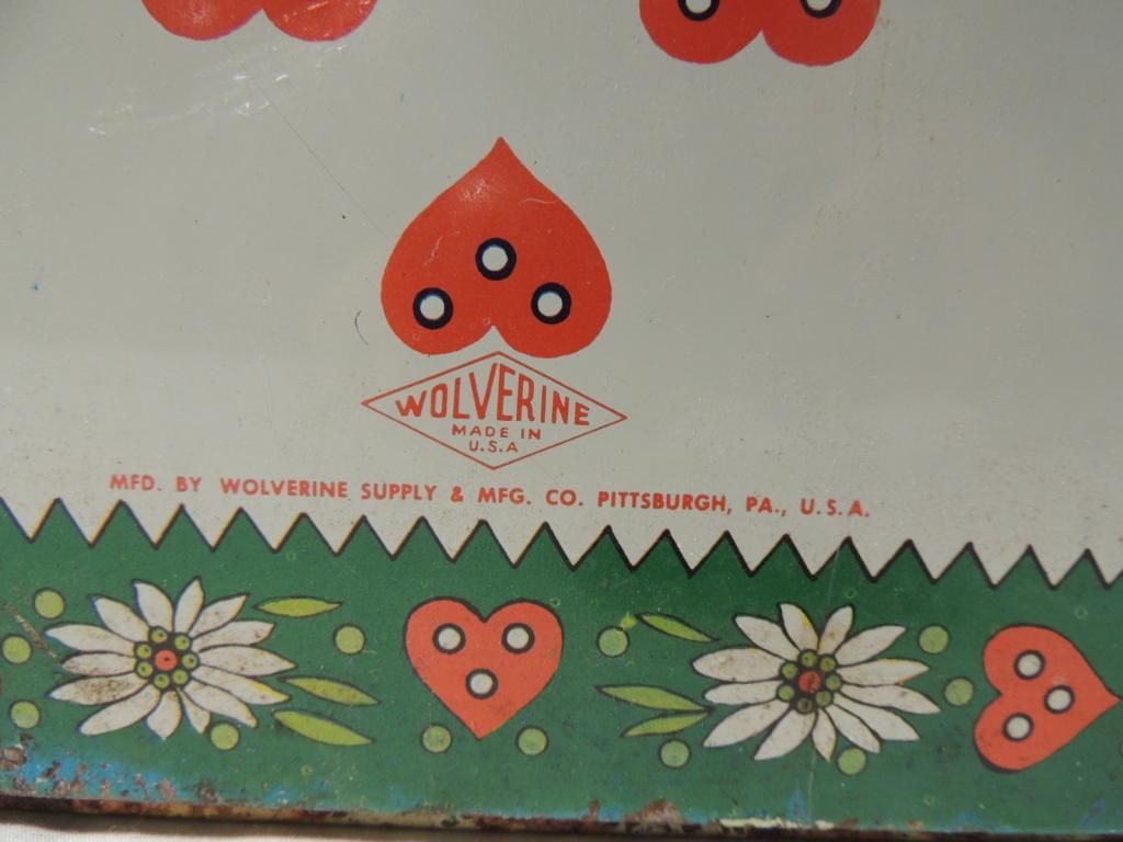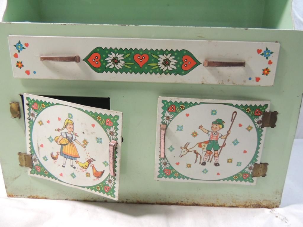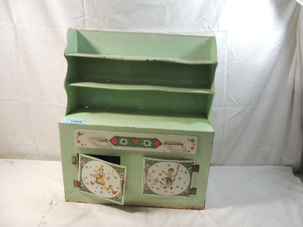 VINTAGE CHILDS METAL CUPBOARD HUTCH KITCHEN WOLVERINE HEMLOCK SCANDINAVIAN WOLVERINE VINTAGE TIN LITHO TOY METAL DOLL KITCHEN CUPBOARD CABINET HUTCH HEIDI AS SHOWN SEE PHOTO FOR MORE DETAILS.