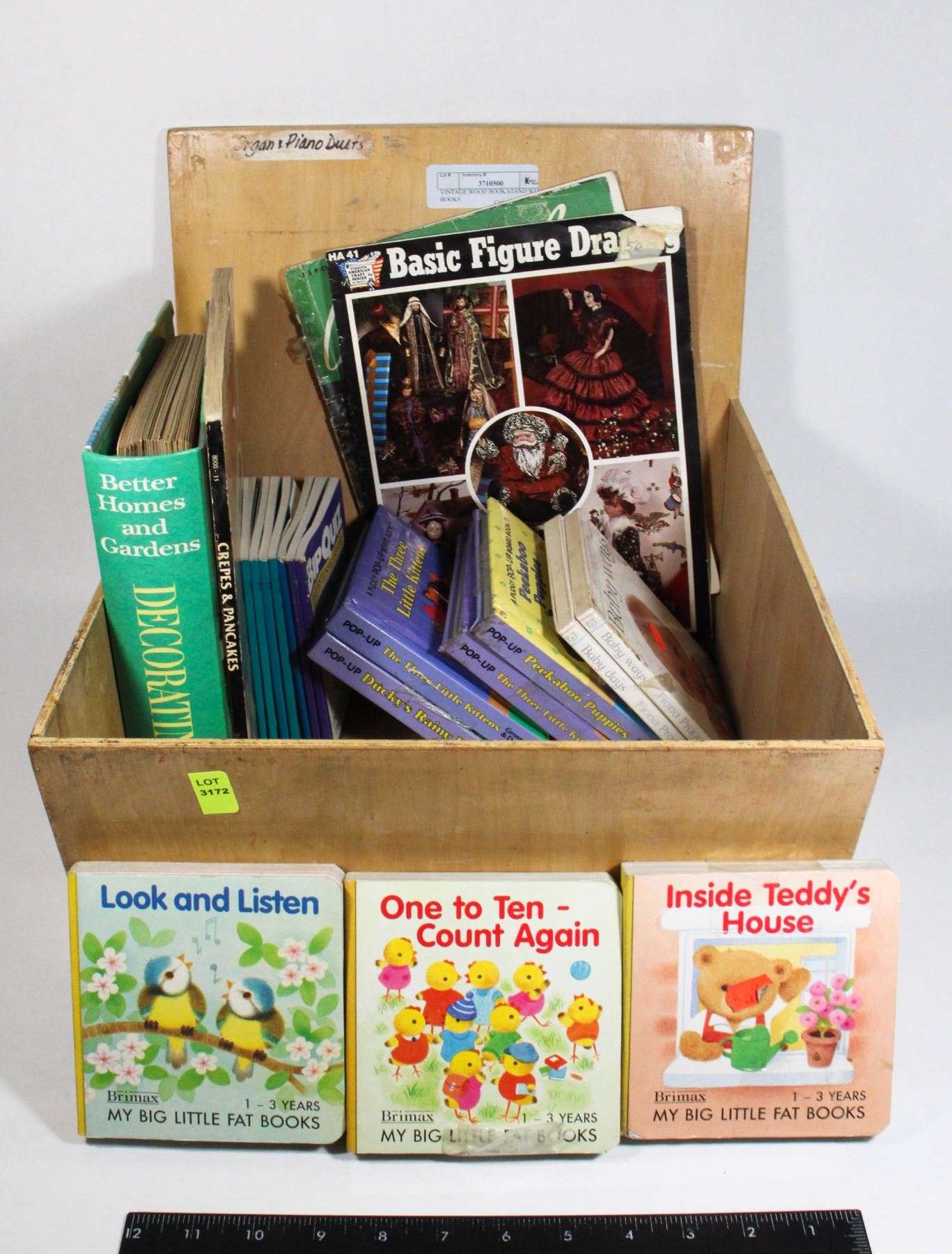 VINTAGE WOOD BOOK STAND WITH VINTAGE BOOKS AND MAGAZINES.
