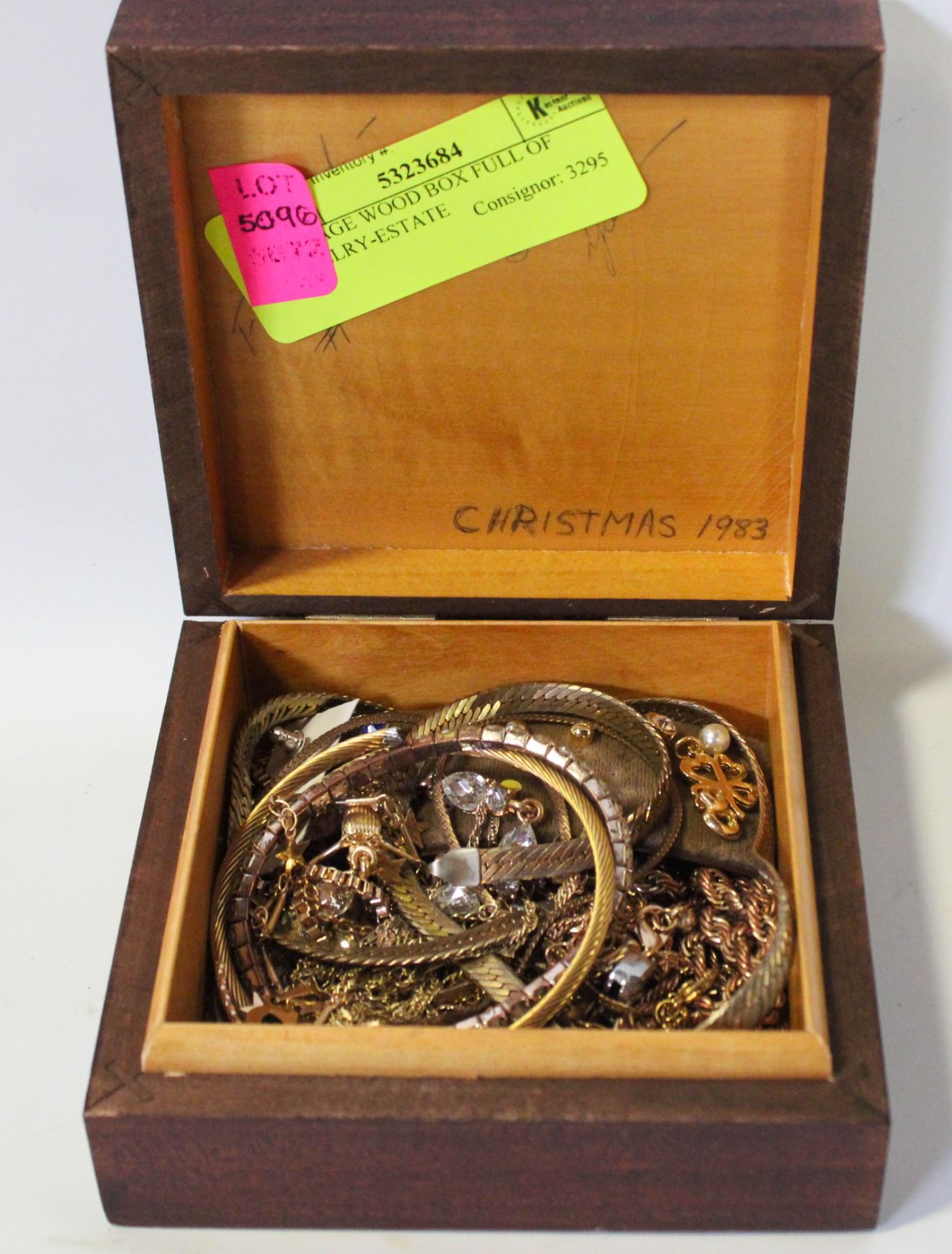 VINTAGE WOOD BOX FULL OF JEWELRY-ESTATE