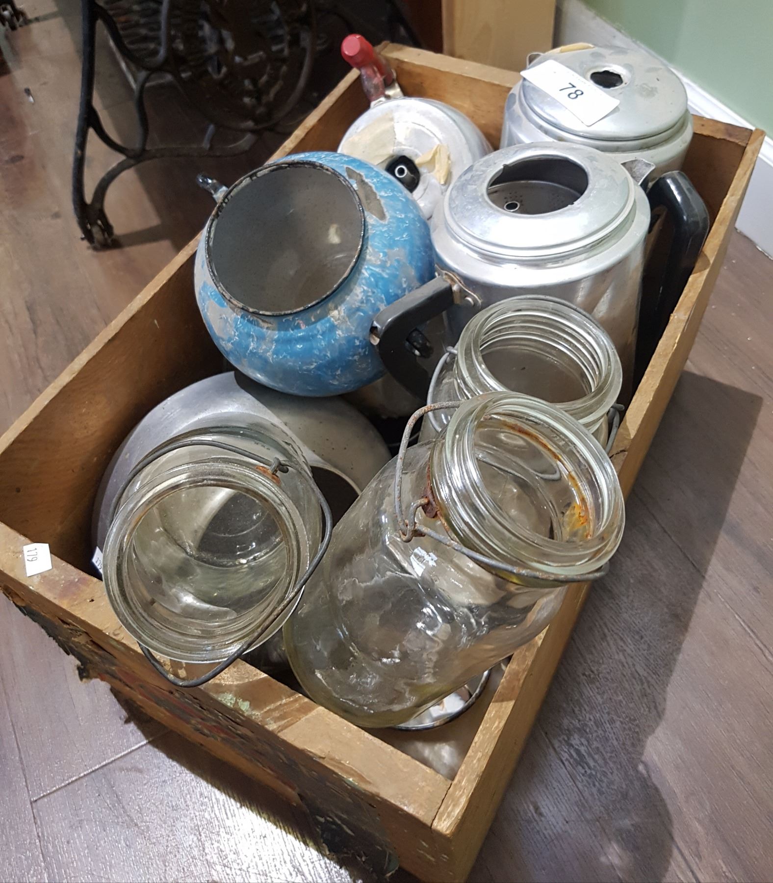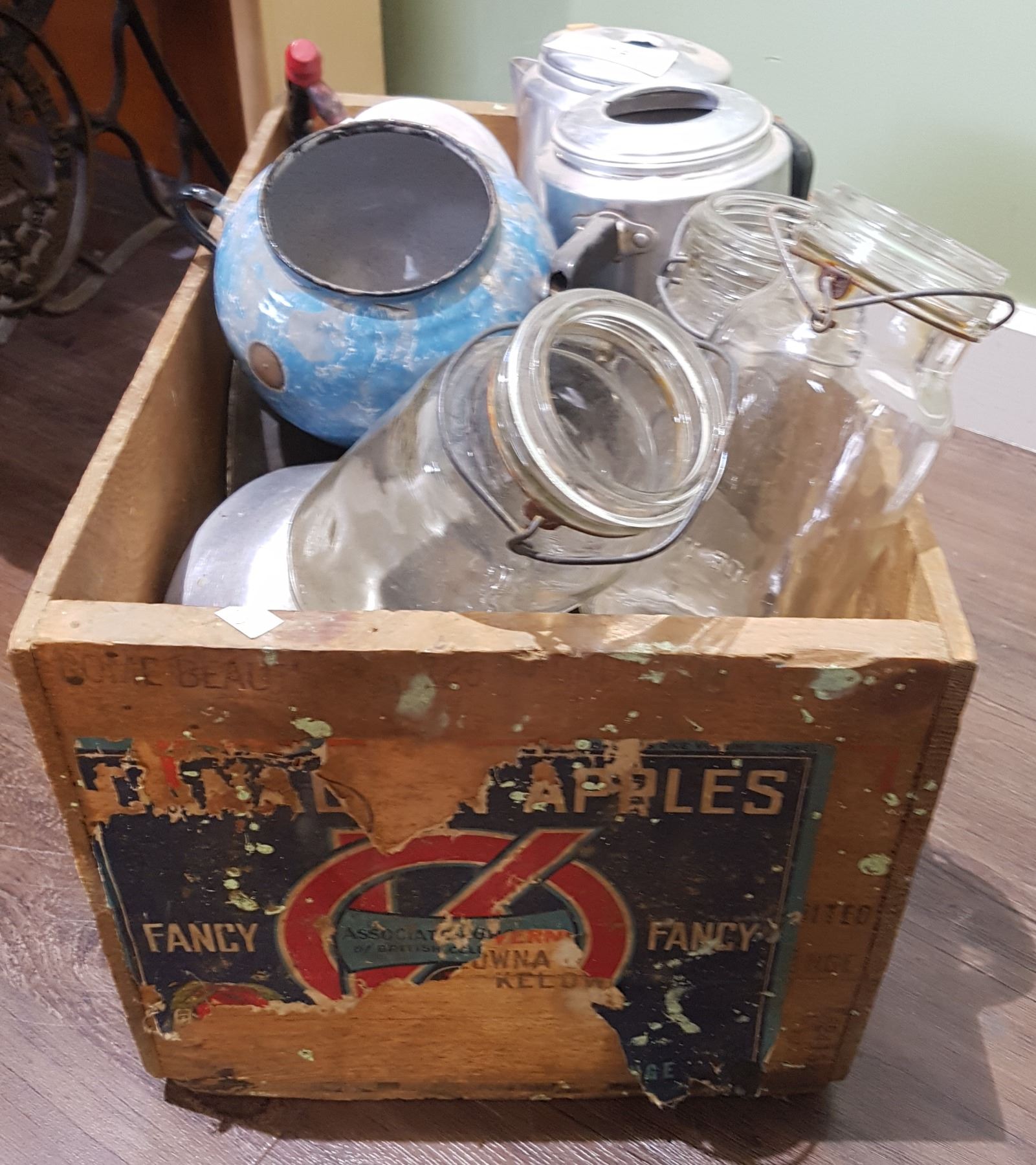 VINTAGE WOOD BOX W/MISC JARS, COFFEE POTS ETC
