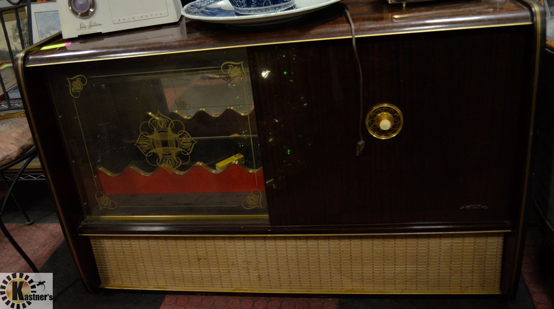 VINTAGE WOOD CONSOLE STEREO WITH WINE RACK