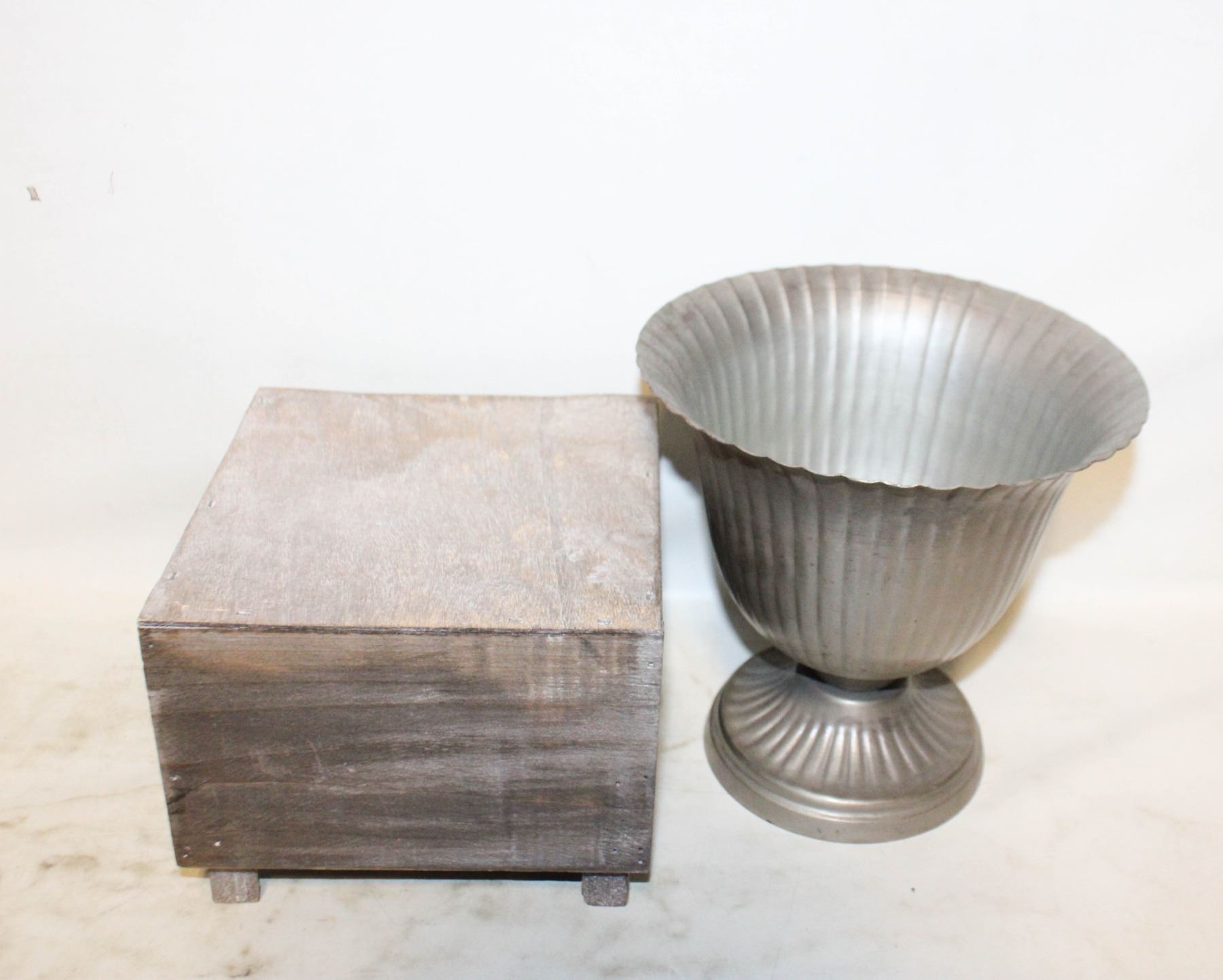 VINTAGE WOOD DISPLAY RISER & METAL VASE
