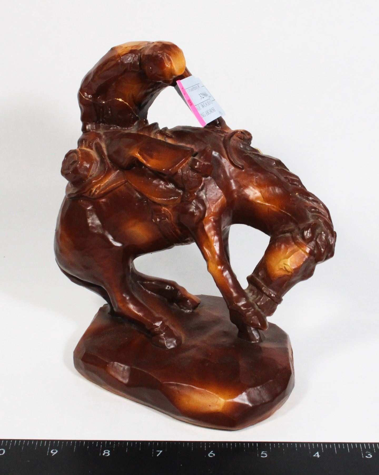 VINTAGE WOOD LOOK COWBOY ON BUCKING HORSE. MADE IN CANADA, AMY ARTICRAFTS LTD.RADIUM HOT SPRINGS, B.C.CHECK PICTURES FOR CONDITION (REPAIRED DAMAGE VISIBLE)