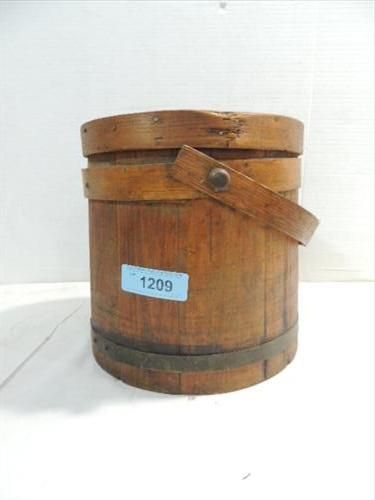 VINTAGE WOOD & METAL STRAP LIDDED BUCKET WITH HOOP HANDLE. GREAT CRAFTSMANSHIP. AS SHOWN. VIEW PICTURE FOR DETAIL.