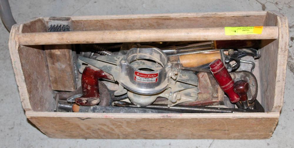 VINTAGE WOOD TOOL BOX W/ASSORTED TOOLS