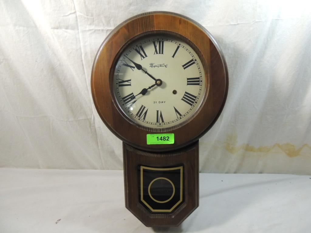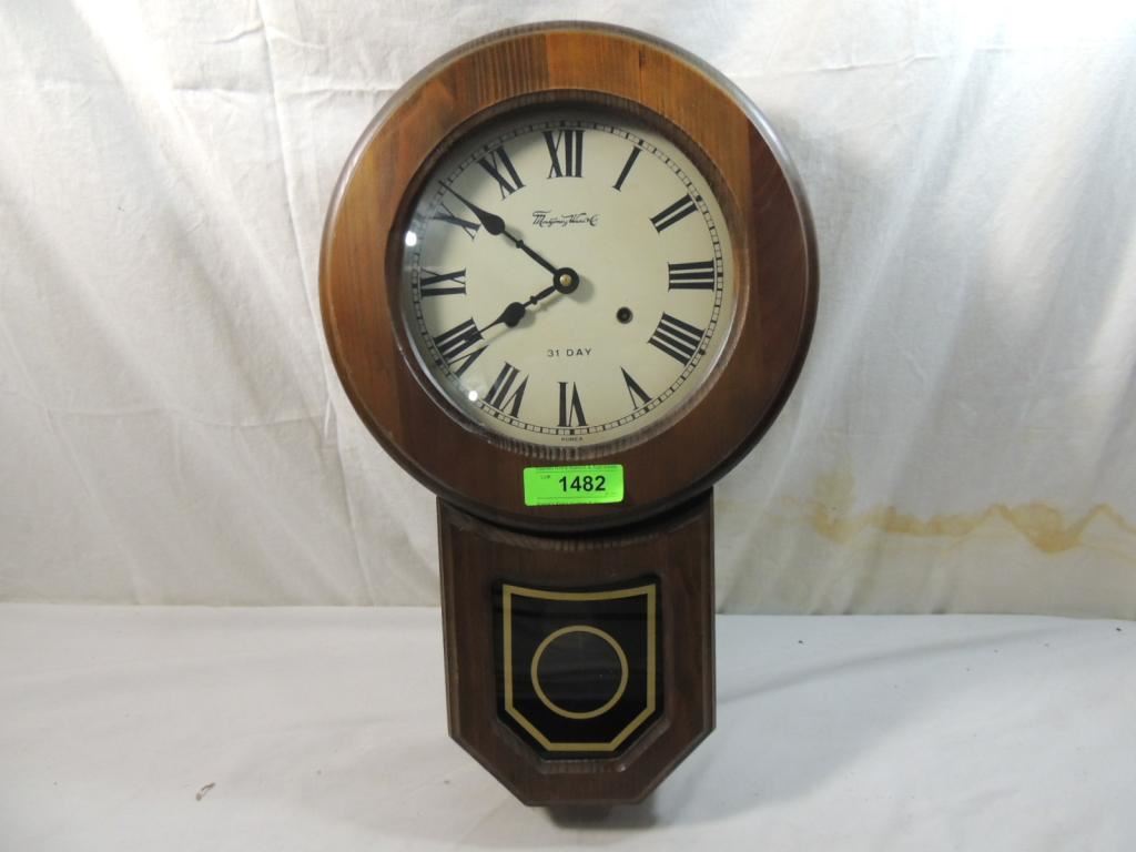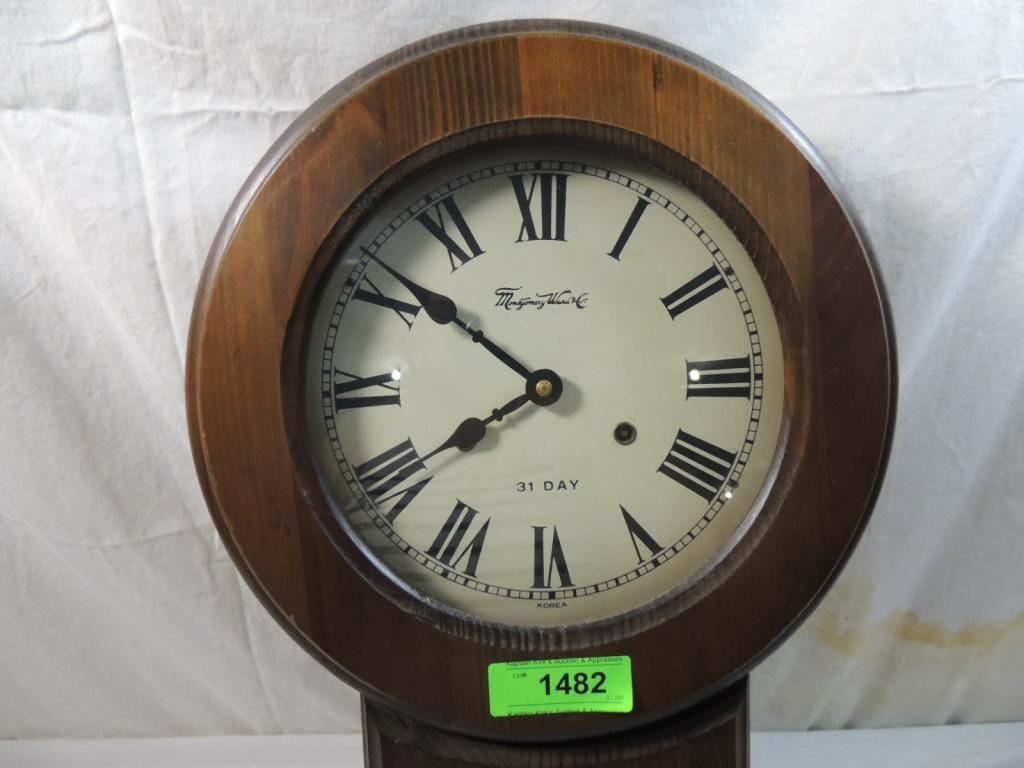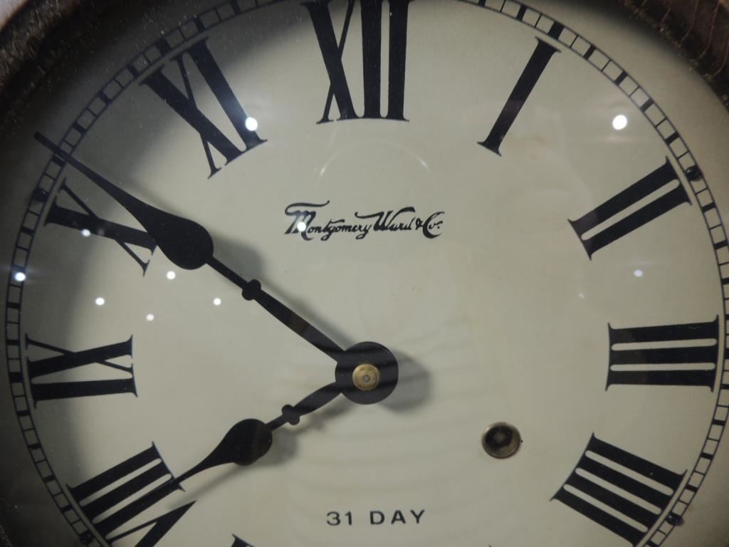 WALL CLOCK, VINTAGE MONTGOMY WARD CLOCK, WOOD CHIME DECORATIVE AS SHOWN SEE PHOTO FOR MORE DETAILS.