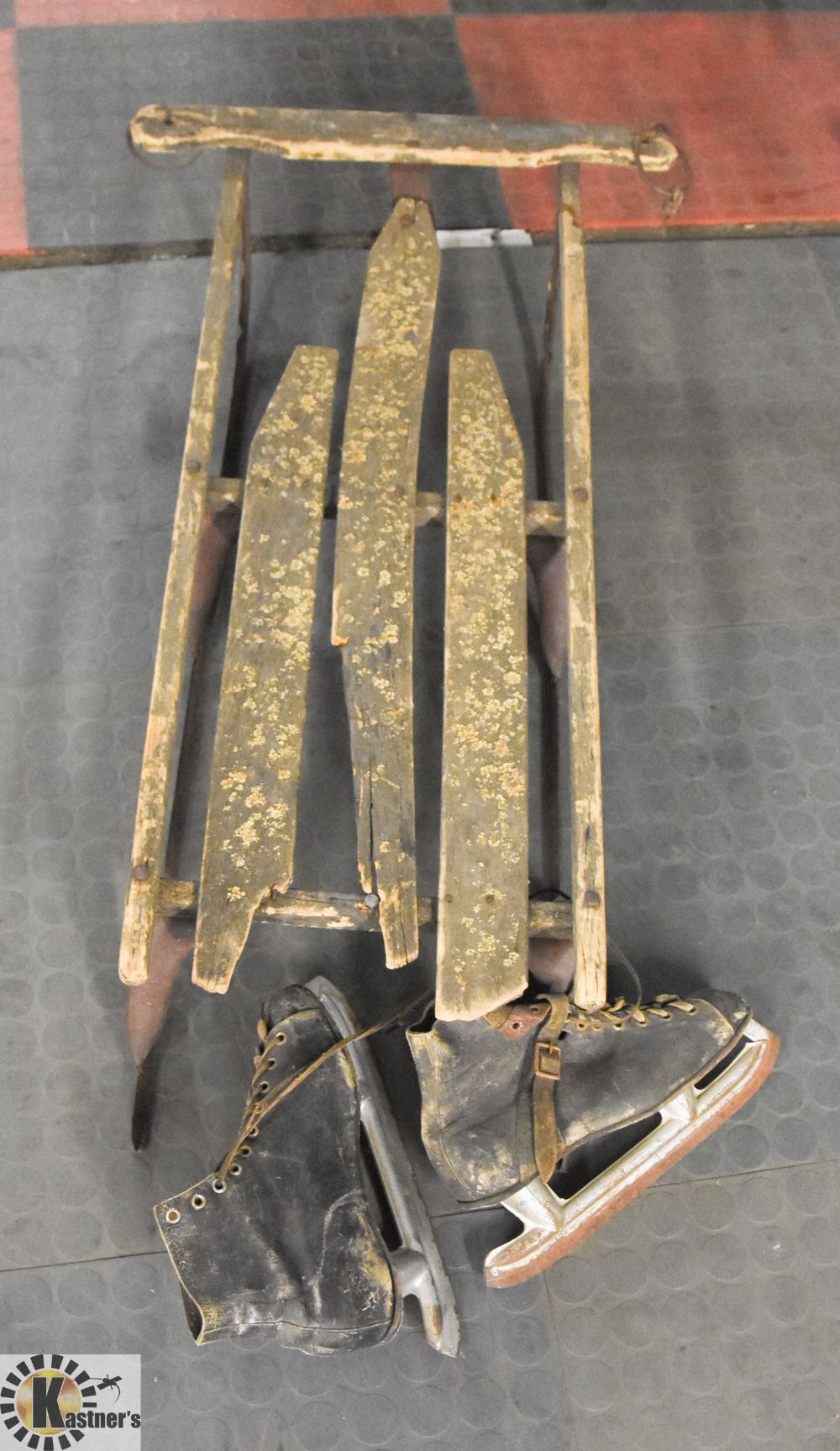 VINTAGE WOODEN AND METAL TOBOGGAN + VINTAGE SKATES