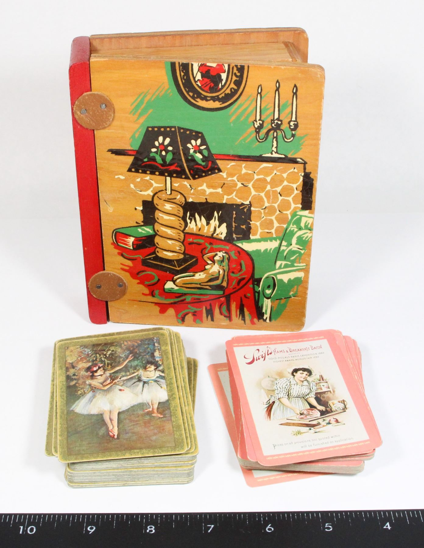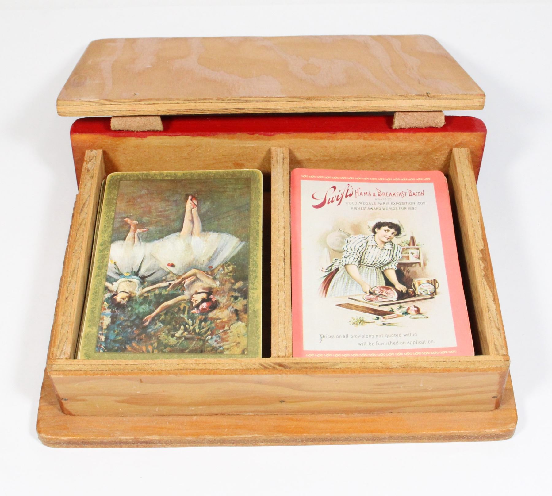 VINTAGE WOODEN BOX WITH 2 SET OF OLD CARDS.