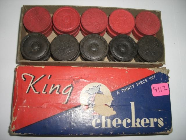 VINTAGE WOODEN *COMPLETE* RED & BLACK *KING CHECKERS* IN THE ORIGINAL BOX!! ITEM CAME OUT OF SAFE!! ***Coin, Currency & All Items Listed in this auction - Grades, Conditions and Values are not Safe Deposit Coins LLC Responsibilty. Grades, Condition and Values are determined by Consigner(s) & Buyers ONLY