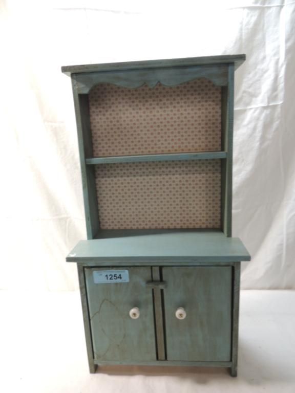 BLUE WOODEN VINTAGE DOLL HUTCH CABINET 24" TALL PAPERED BACK GREAT CONDITION AS SHOWN SEE PHOTO FOR MORE DETAILS.