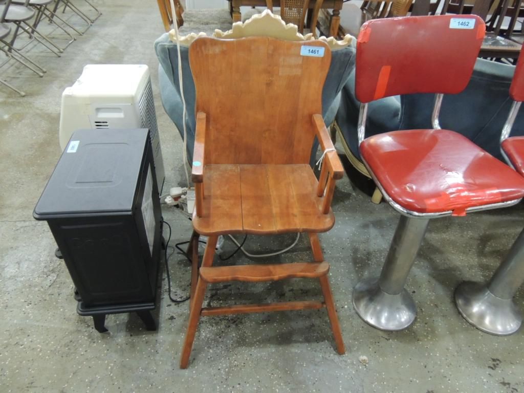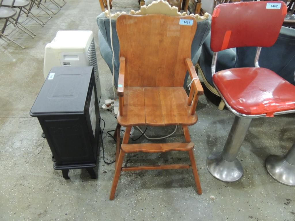 WOODEN VINTAGE HIGH CHAIR NO TRAY. AS SHOWN SEE PHOTO FOR MORE DETAILS.