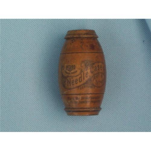 This is a quality wooden Needle Case. The graphics are very good and are present on both sides; this includes ASBRO Trade Mark, Germany, Art B 3/740, "Accept My Best Wishes", Patented No 2001. The top turns to the desired size with a hole to allow the needle to come out.