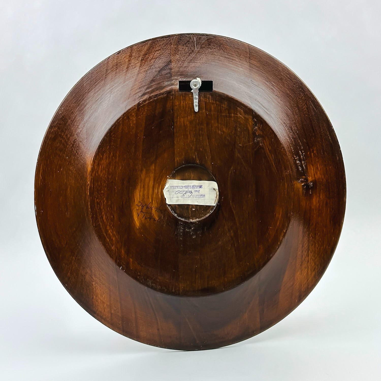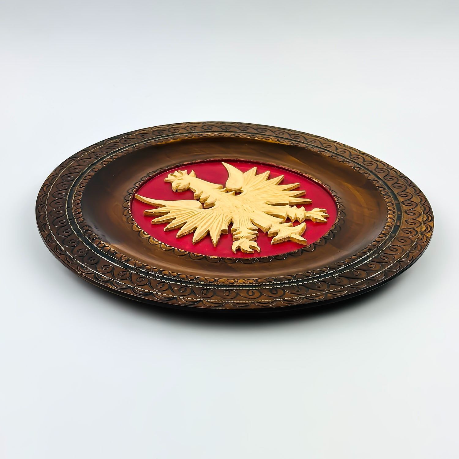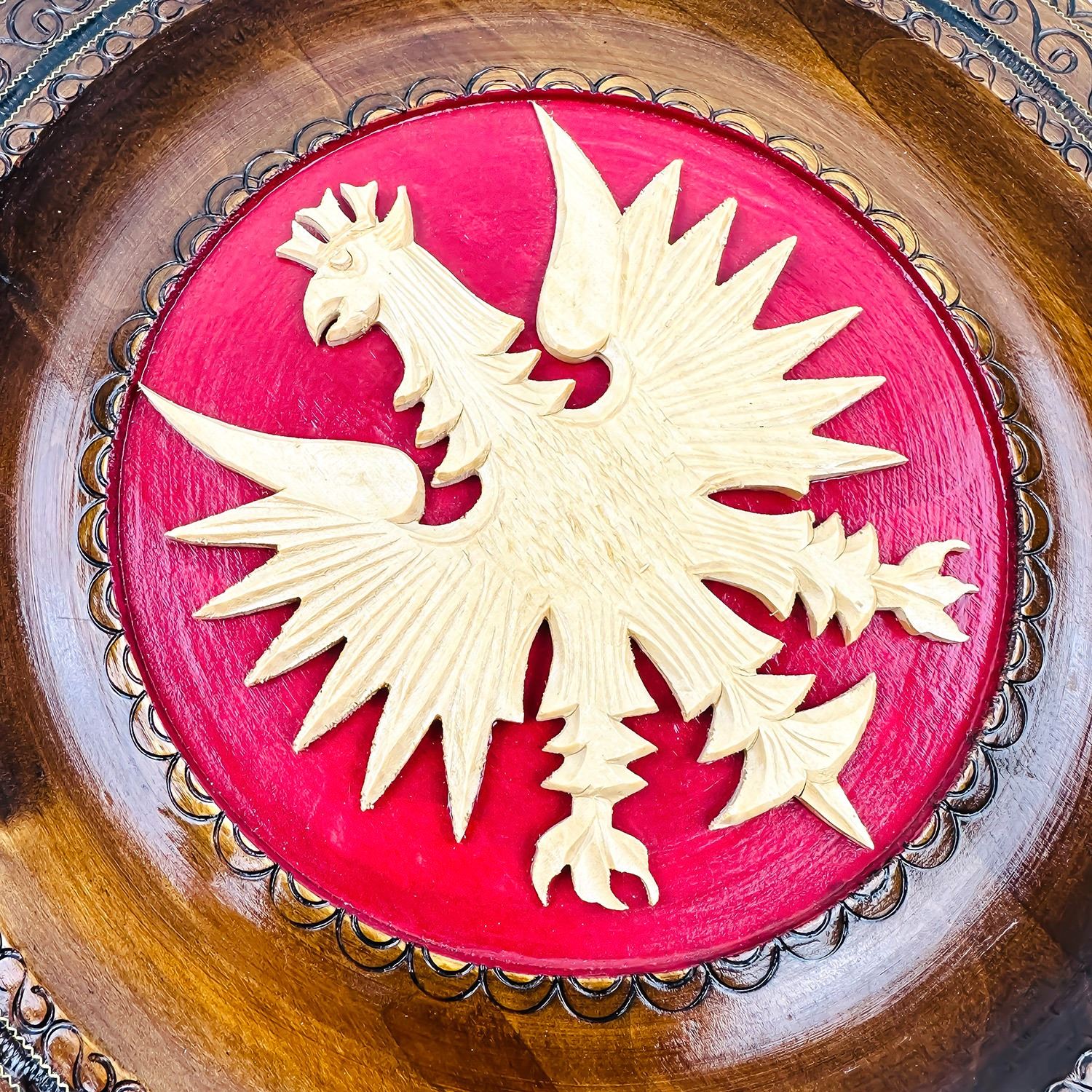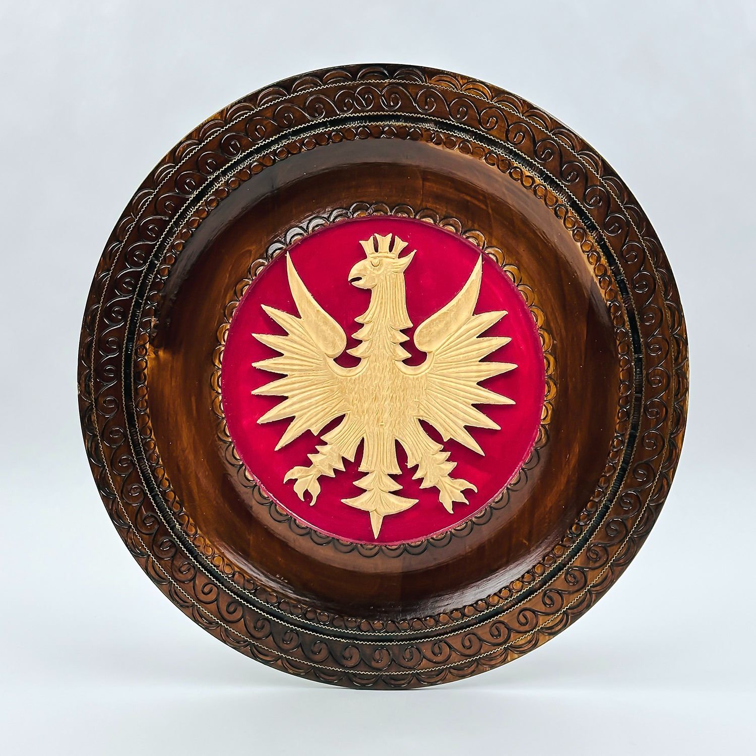 #8359 - HAND CARVED AND SIGNED WOODEN PLATE WALL PLAQUE. WOODEN SCULPTURE CARVING WITH POLISH CREST - COAT OF ARMS - CROWNED WHITE EAGLE ON RED. MEASURES: 11.75” (30 CM) DIAMETER AND .75” (2 CM) THICK