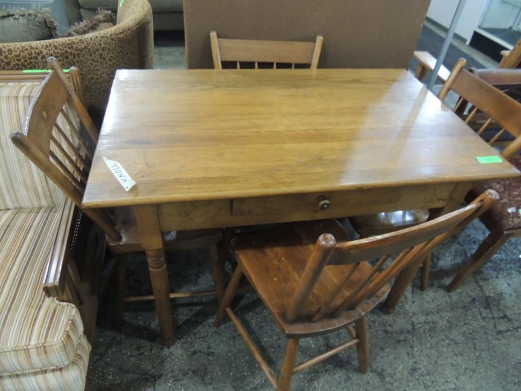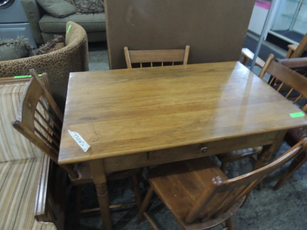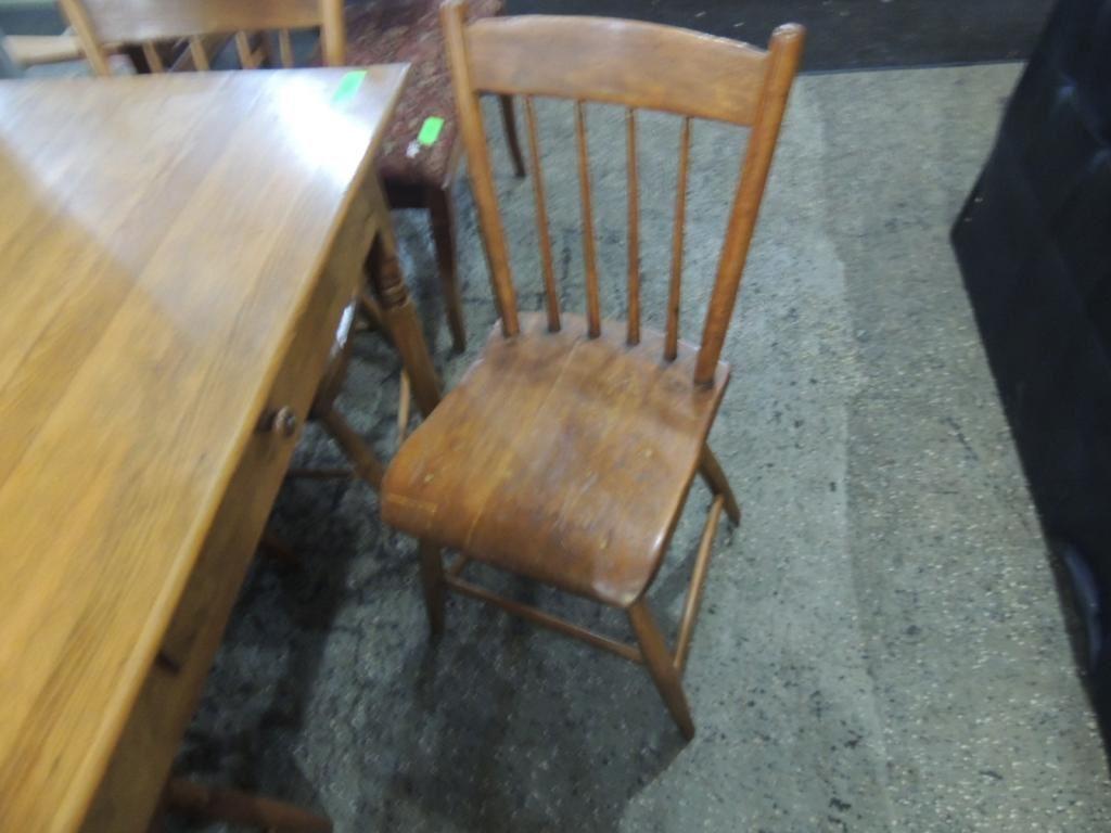 EARLY AMERICAN VINTAGE TABLE & CHAIRS DESK, CHAIRS, WOODEN TABLE, KITCHEN TABLE & CHAIRS, AS SHOWN SEE PHOTO FOR MORE DETAILS.