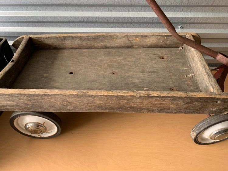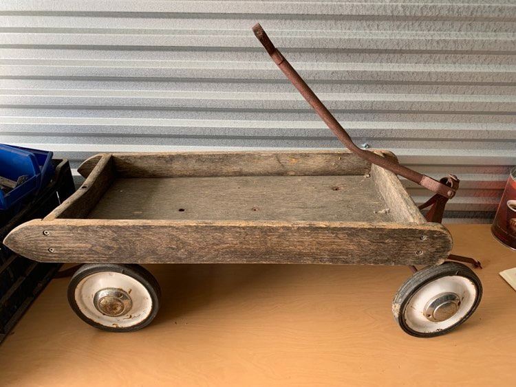 VINTAGE WOODEN WAGON. COMPLETE, MISSING BOLTS. EASY FIX!