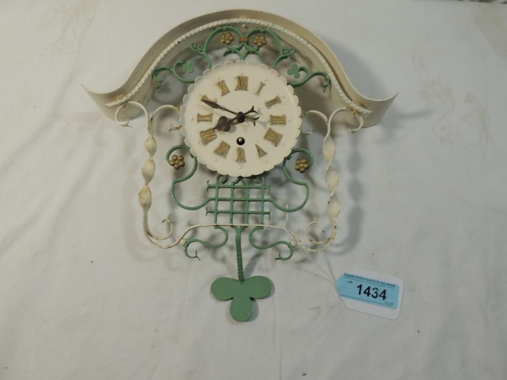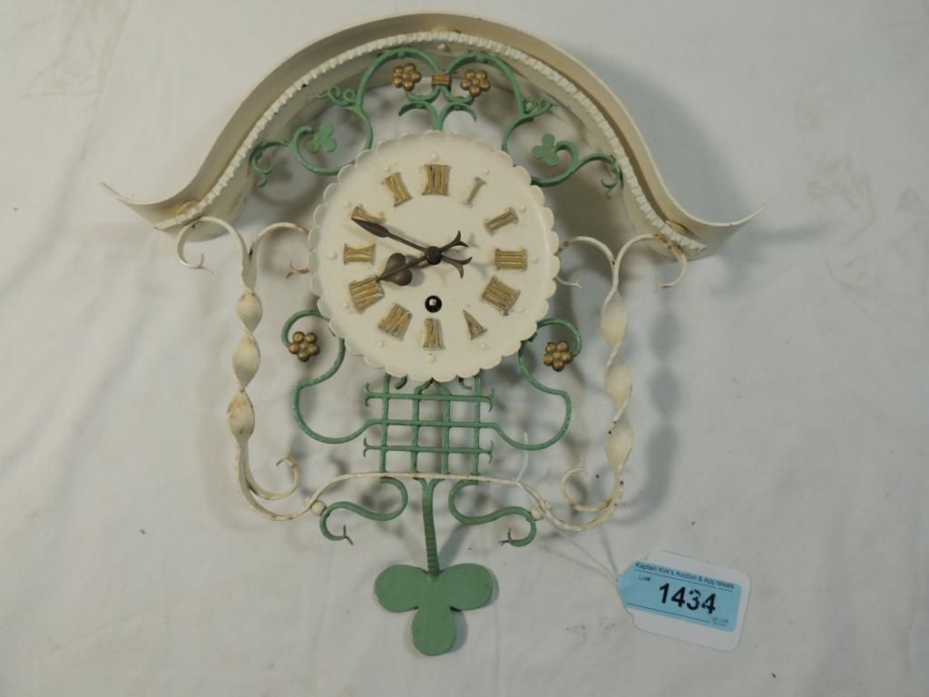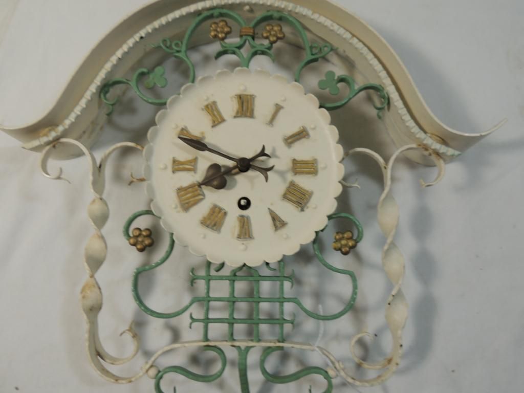 WHITE AND GREEN WROUGHT IRON WALL CLOCK. DECORATIVE AS SHOWN SEE PHOTO FOR MORE DETAILS.