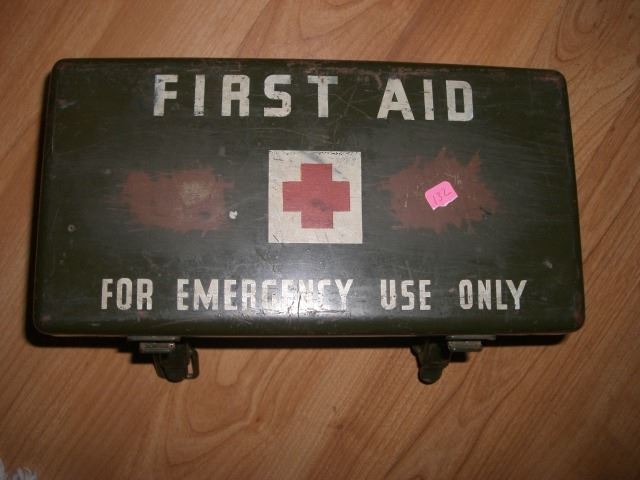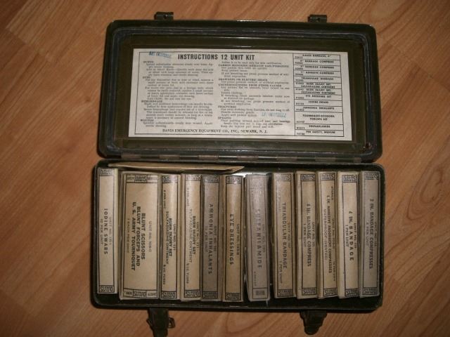 VINTAGE WWII *COMPLETE* ISSUED 12 UNIT FIRST AID MEDICAL METAL BOX VALUE $125.00-$175.00 WITH ALL ORIGINAL ITEMS INCLUDED EYE DRESSING/SULFANIAMIDE/BANDAGE/AMMONIA INHALANTS/BURN/BLUNT SCISSORS/IODINE!! ITEM CAME OUT OF ESTATE!! ***Coin, Currency & All Items Listed in this auction - Grades, Conditions and Values are not Safe Deposit Coins LLC Responsibilty. Grades, Condition and Values are determined by Consigner(s) & Buyers ONLY