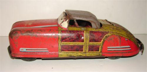 VINTAGE WYANDOTTE TOY CAR. Shows loss to paint throughout. Shows minor rusting. Rubber tires. 12.25" L