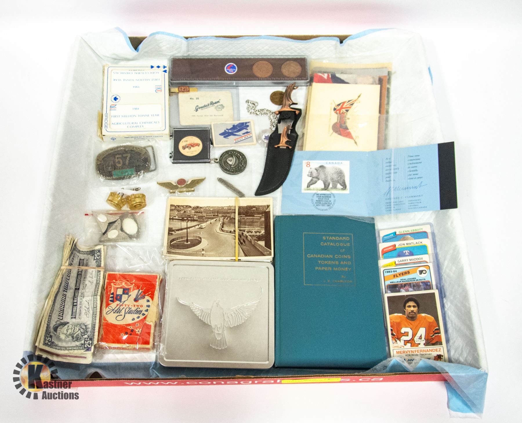 AUSTRALIAN LARGE PENNIES IN CASE 1943, 1962, COLLECTOR OPEE-CHEE 1980'S COLLECTOR CARDS W/OTHERS, 1960 CATOLOGUE OF CANADIAN COINS TOKENS & PAPER MONEY BY WHITMAN, CASHIER DISPLAY CANADA POST 1997 $8.00 STAMP, BUNDLE OF CANADIAN MONEY, MINI KNIFES, 1 **ALL ITEMS MUST BE REMOVED BY 5PM SATURDAY, NOVEMBER 30TH 2024. ALL REMAINING ITEMS WILL BE SUBJECT TO A $6.00 PER DAY STORAGE CHARGE. ANY ITEMS REMAINING AFTER MONDAY, DECEMBER 16TH 2024 WILL BE CONSIDERED FORFEITED. NO REFUNDS WILL BE ISSUED FOR FORFEITED ITEMS. TO SCHEDULE A PICK UP APPOINTMENT CLICK HERE
