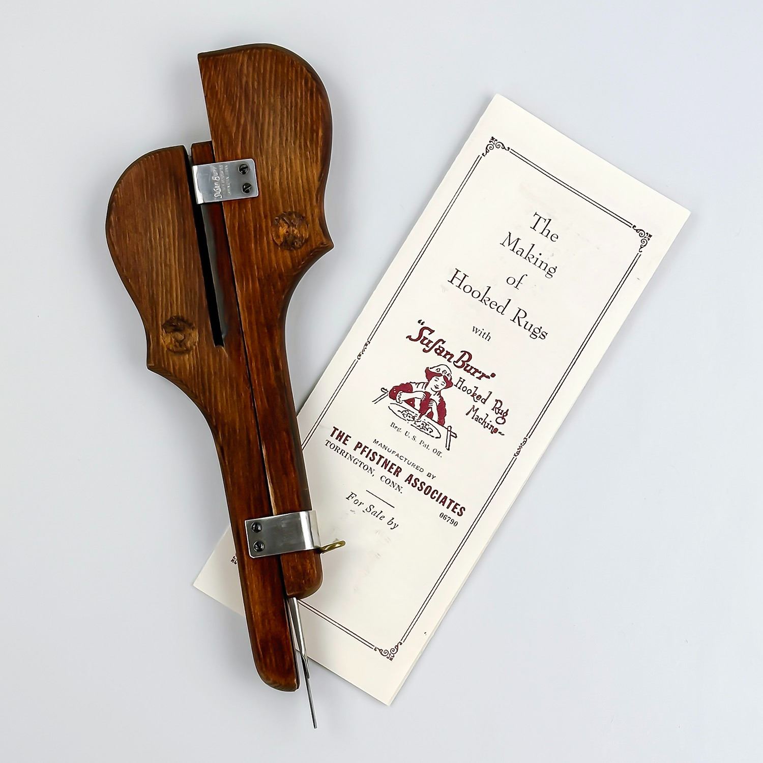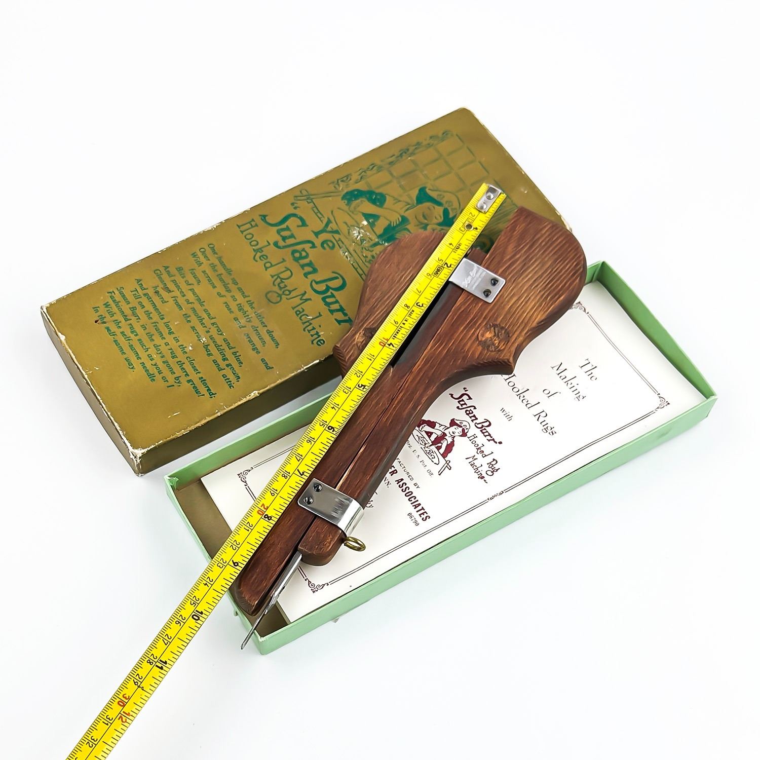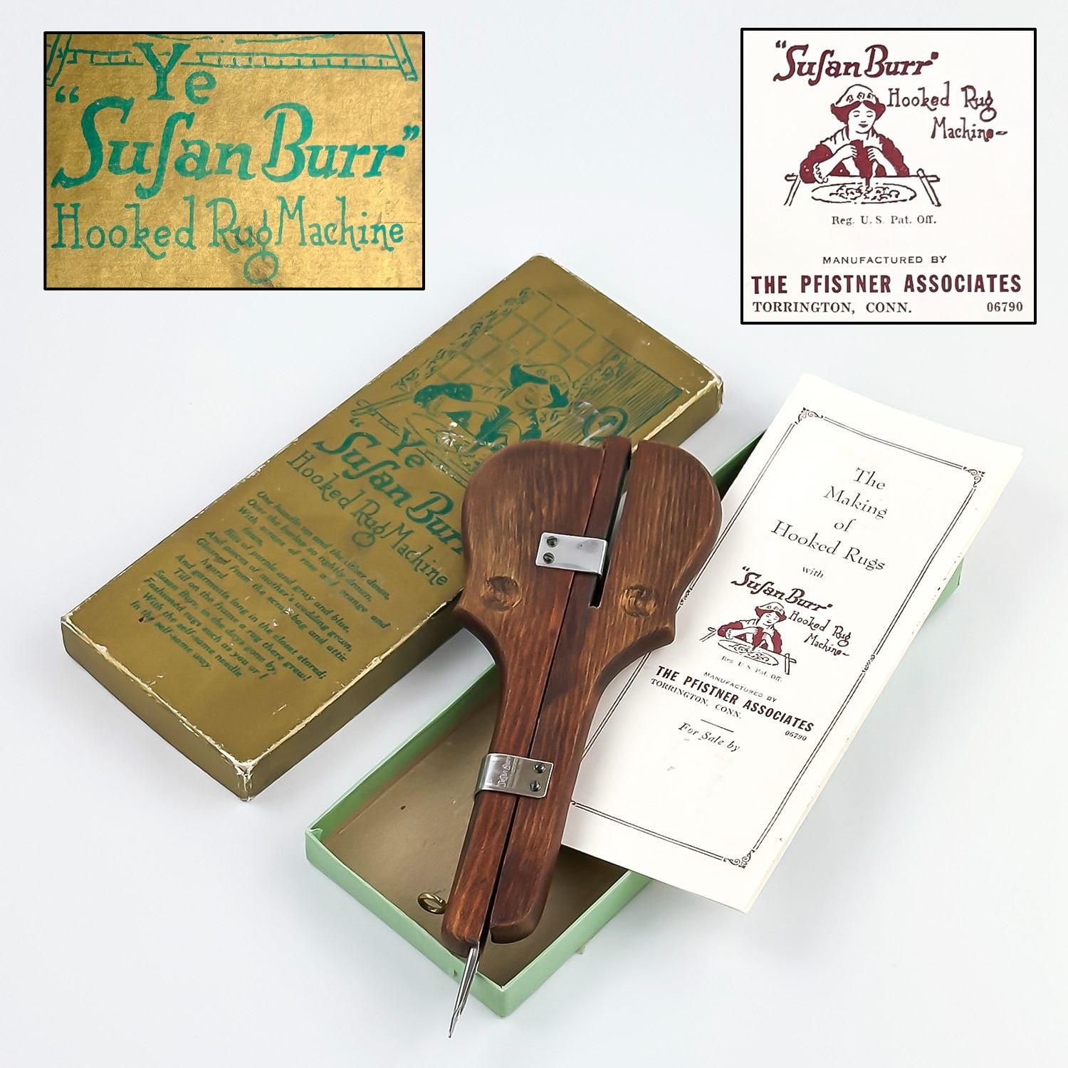 #8717 - VINTAGE SUSAN BURR WOODEN HOOKED RUG MACHINE IN ORIGINAL BOX WITH LEAFLET. MANUFACTURED BY THE PFISTNER ASSOCIATES, TORRINGTON, CONN. RUG HOOKING NEEDLE CRAFT MACHINE SEWING TOOL. BOX MEASURES: 3.75” (9.5 CM) BY 9.5” (24 CM) - SAME SIZE FOR THE TOOL ITSELF