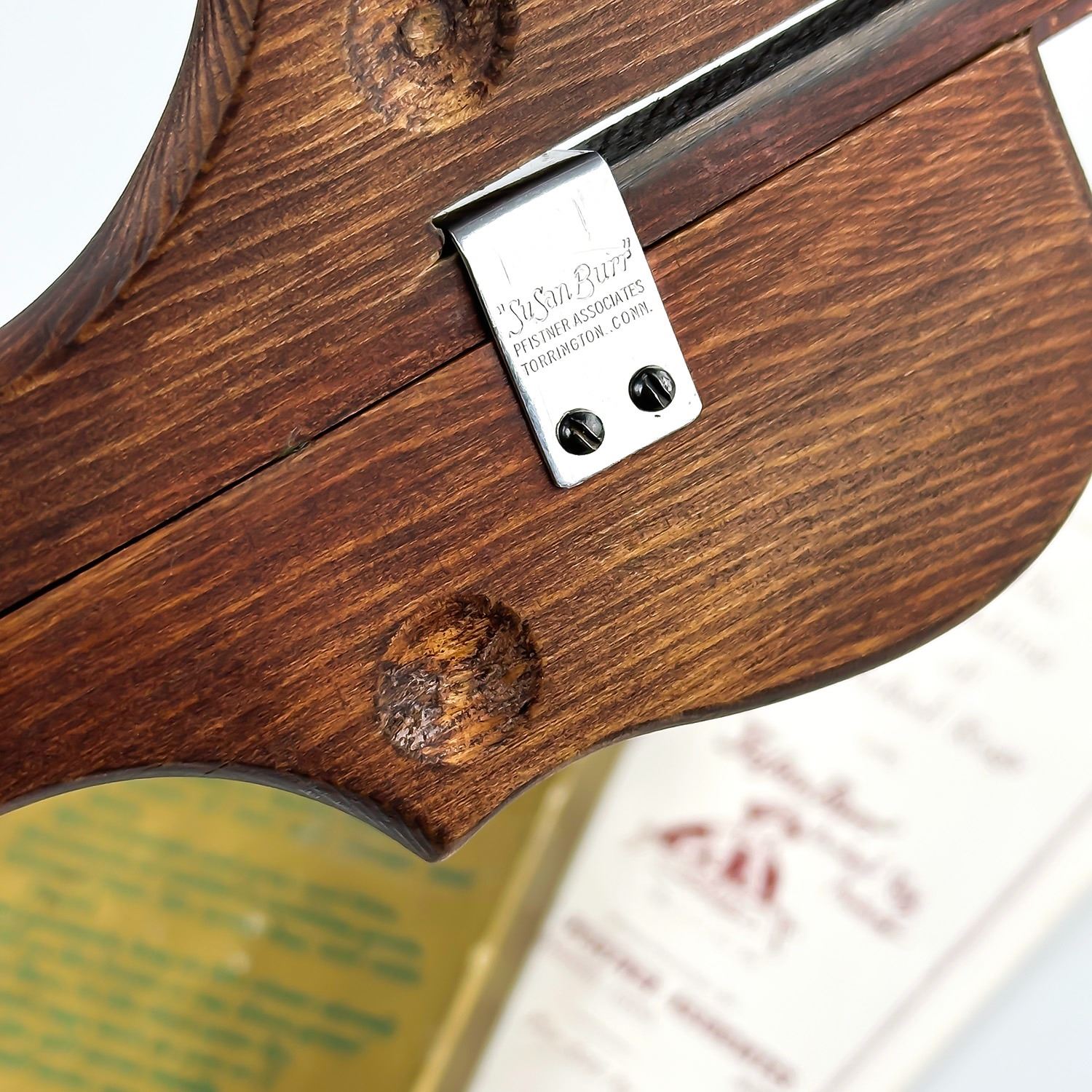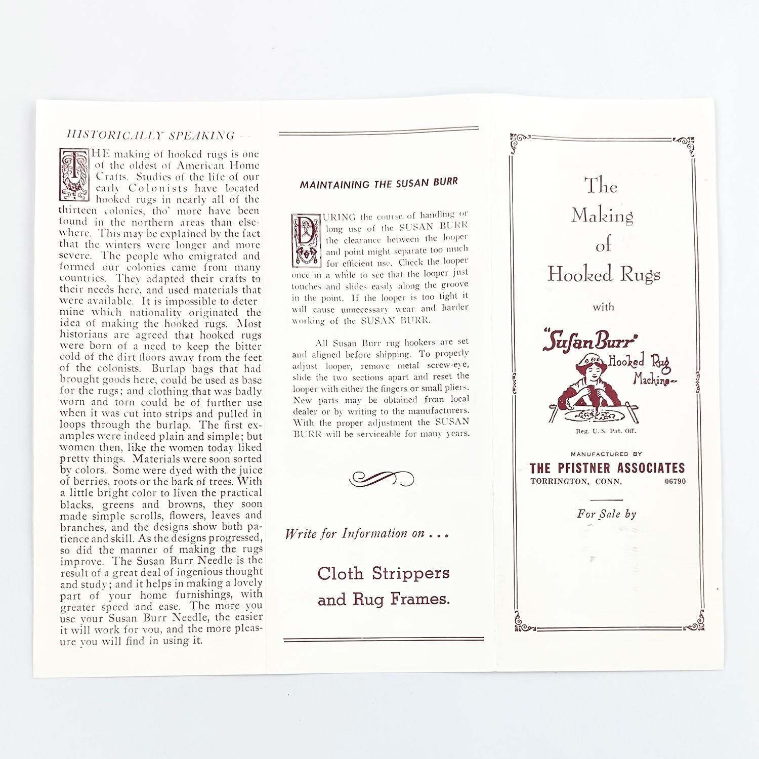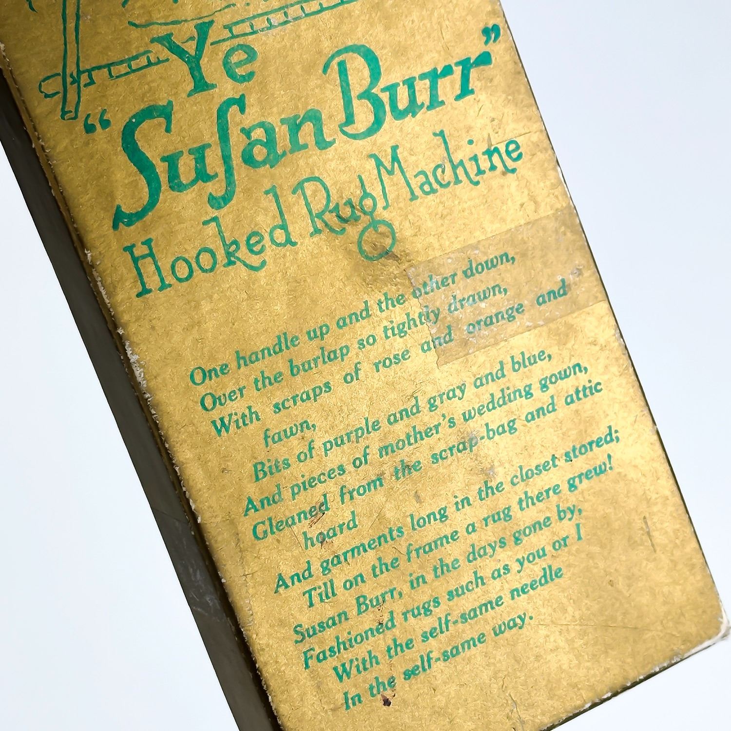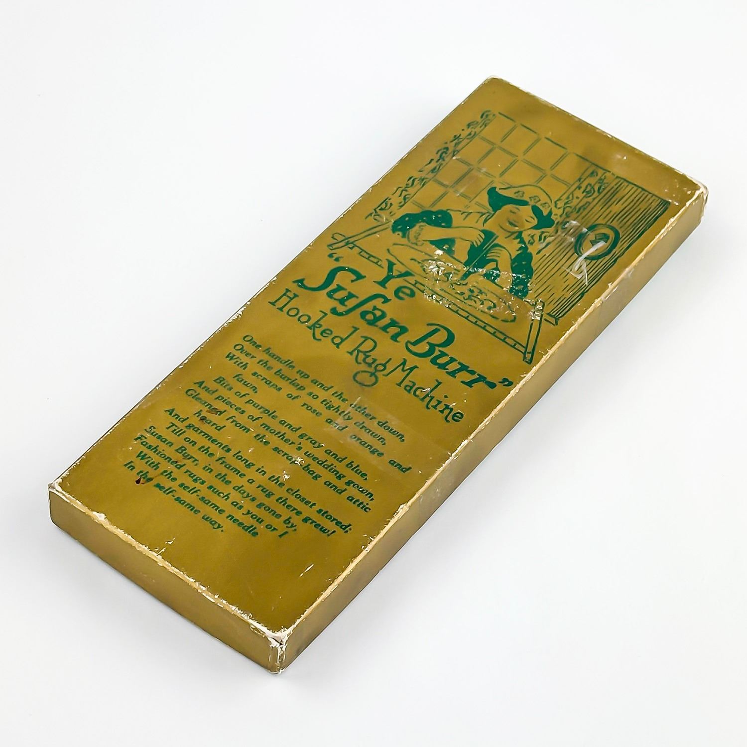 #8717 - VINTAGE SUSAN BURR WOODEN HOOKED RUG MACHINE IN ORIGINAL BOX WITH LEAFLET. MANUFACTURED BY THE PFISTNER ASSOCIATES, TORRINGTON, CONN. RUG HOOKING NEEDLE CRAFT MACHINE SEWING TOOL. BOX MEASURES: 3.75” (9.5 CM) BY 9.5” (24 CM) - SAME SIZE FOR THE TOOL ITSELF
